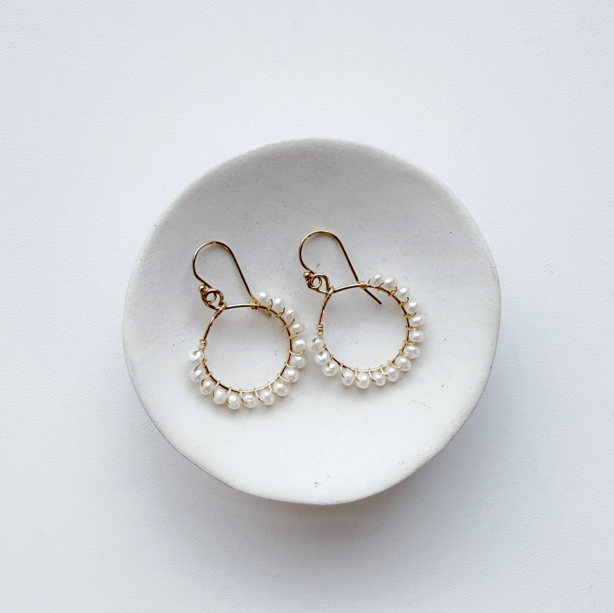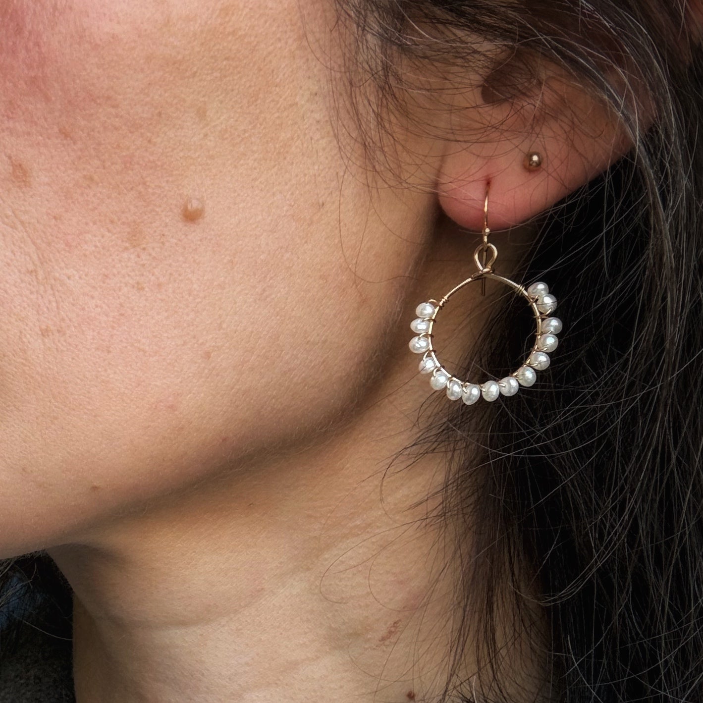 Each 14K gold filled circle of our Isa Earrings is adorned with tiny pearl and wire wrapped by hand.  They are the perfect size for elevating your everyday look.  Great for gifting to yourself or someone special.