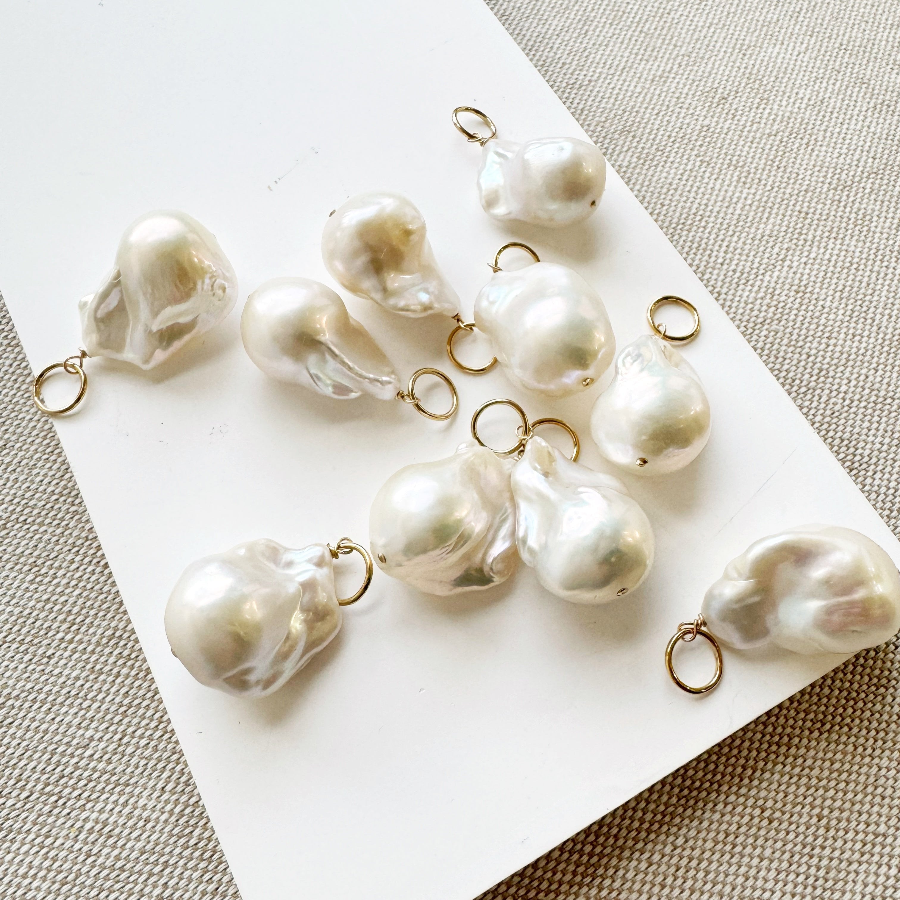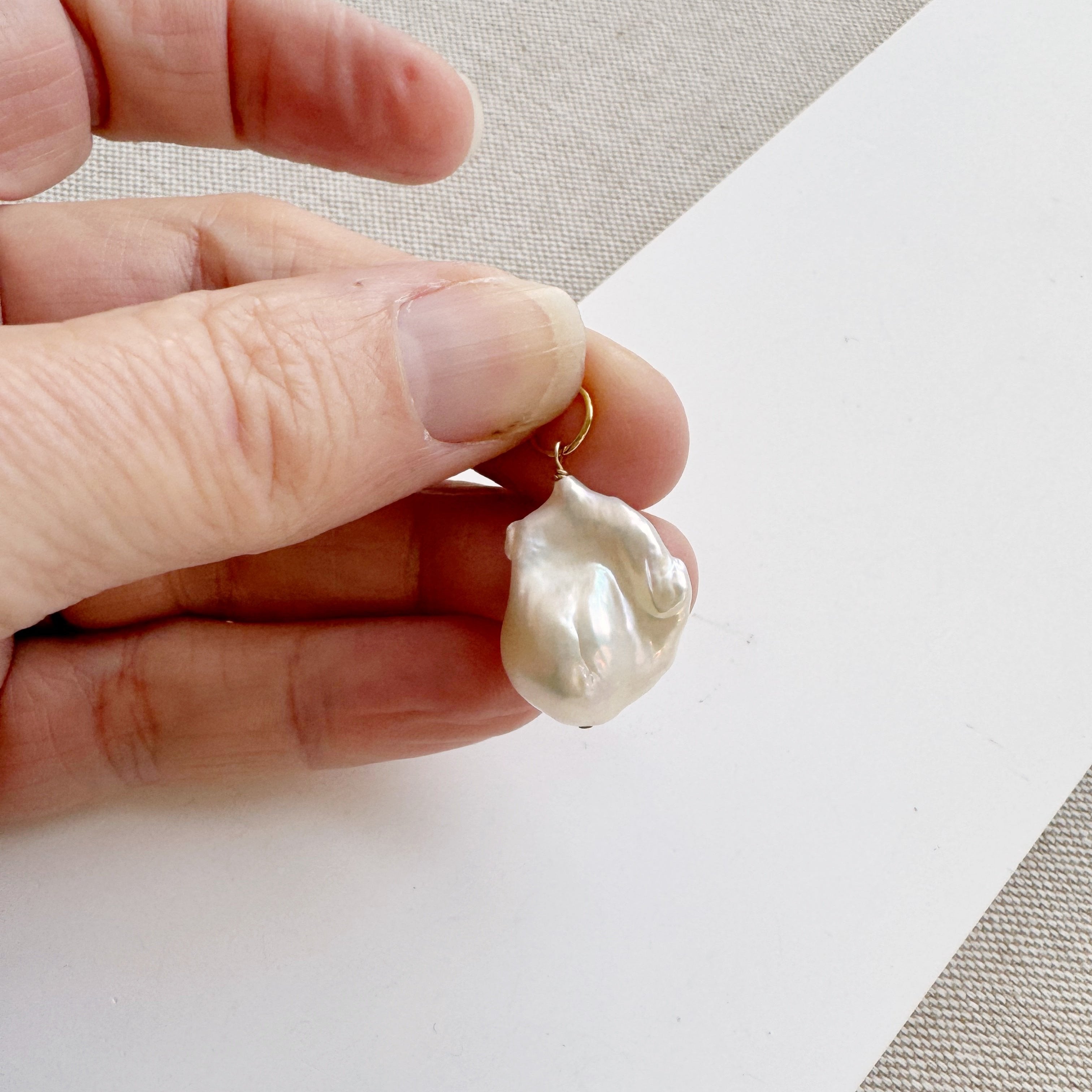 A stunning baroque pearl in a shimmery white color. A little over an inch in length from top to bottom.