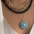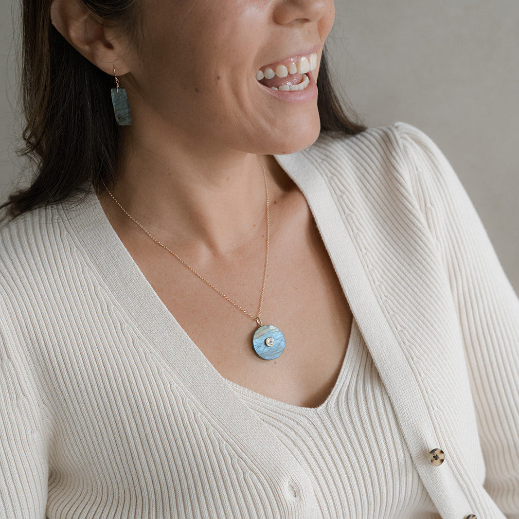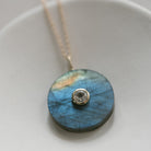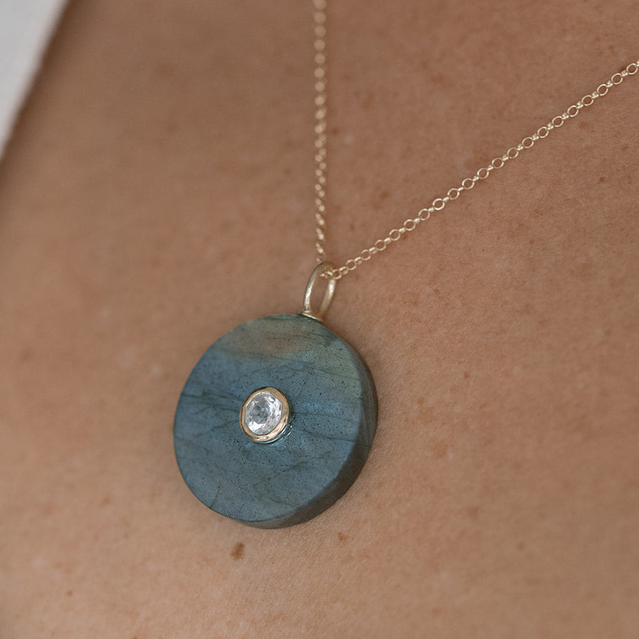 A statement sized pendant showcasing all the stunning attributes of labradorite - glowing shimmer and signature flash, along with an inset CZ stone. Our Mavis Necklace will be a conversation starter wherever you wear it.