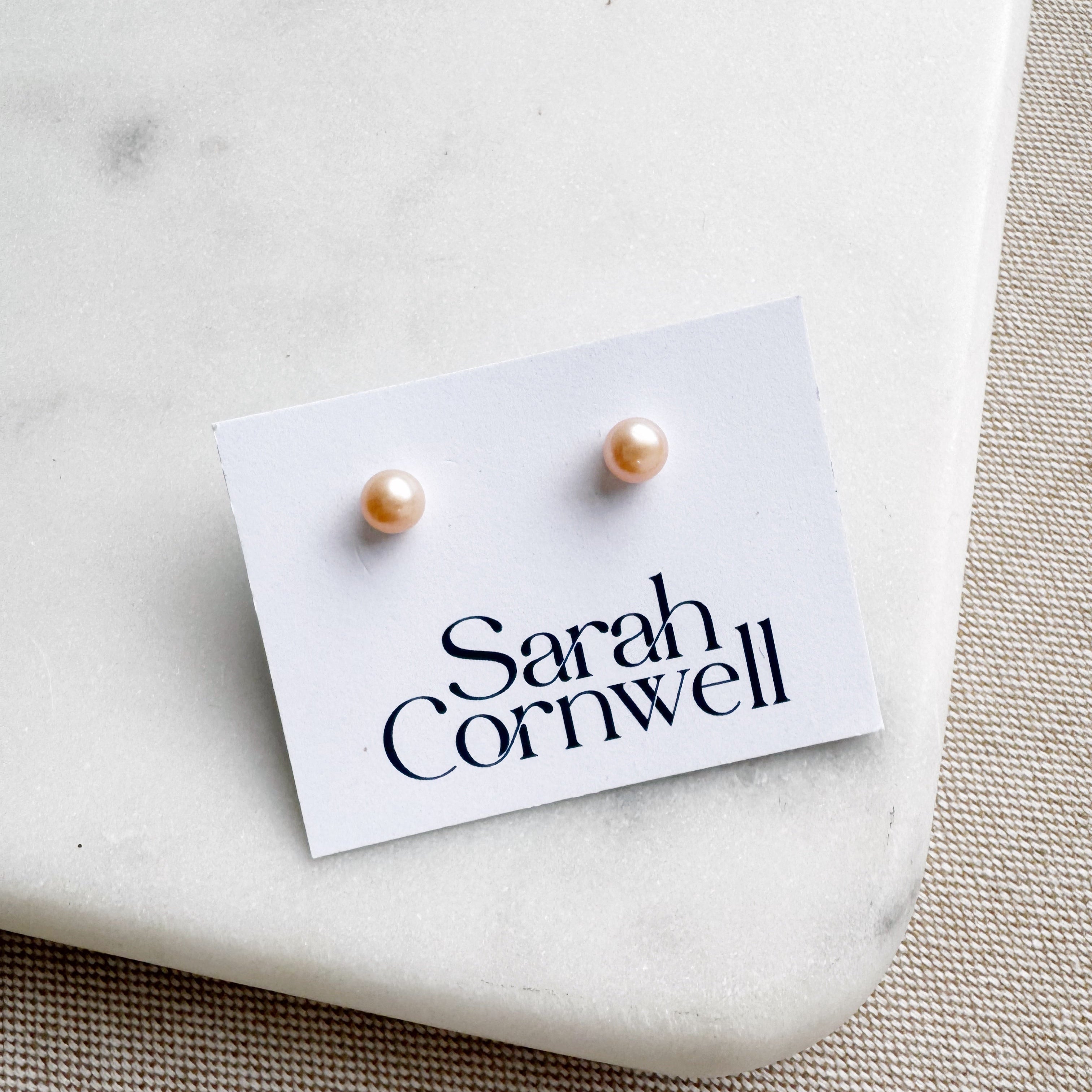 Delicate and sweet peachy pink freshwater pearl studs in 2 versatile sizes, radiating a subtle warmth and charm. These lovely studs bring a gentle pop of color to your look, infusing your day with a touch of feminine grace and a hint of playful sophistication.