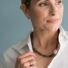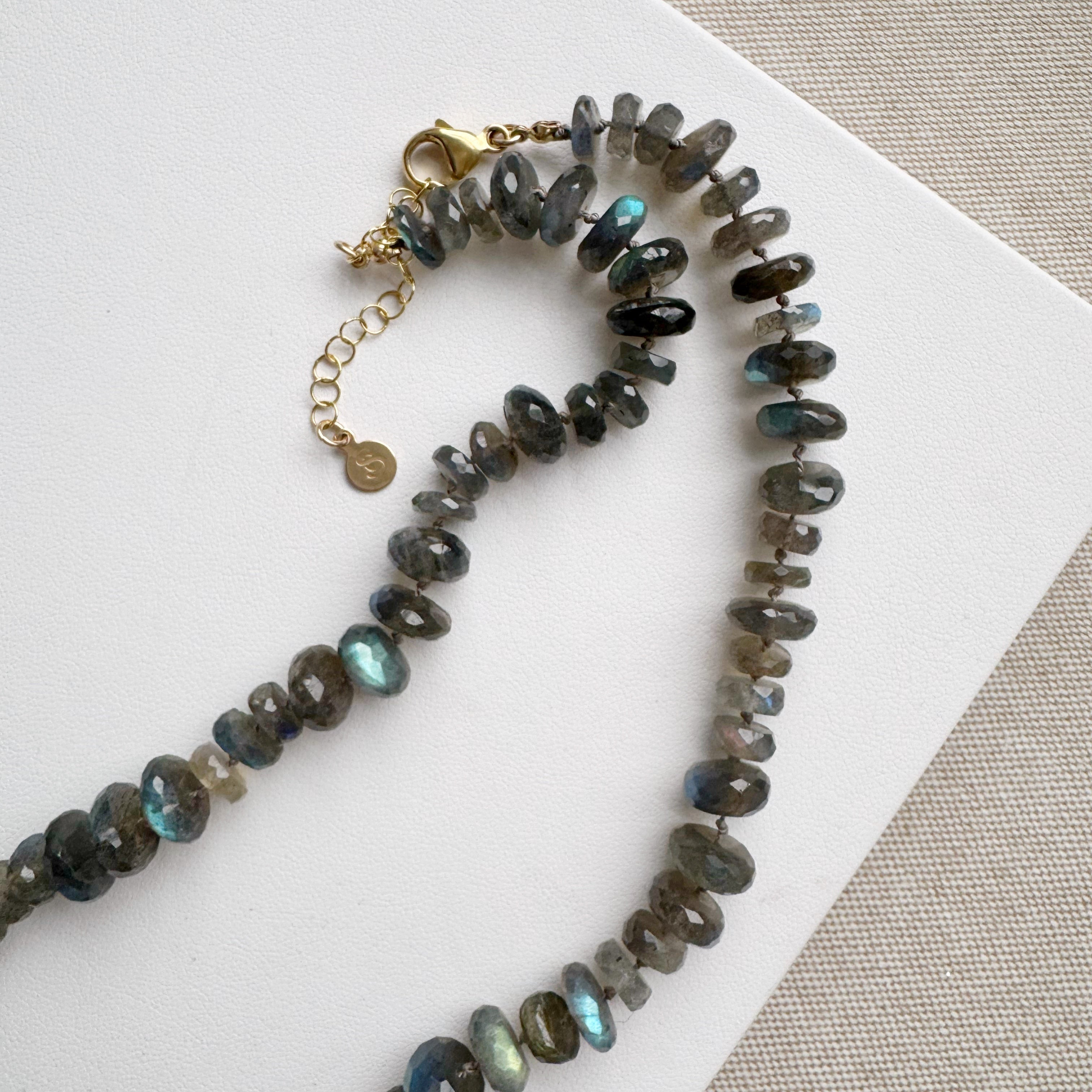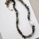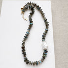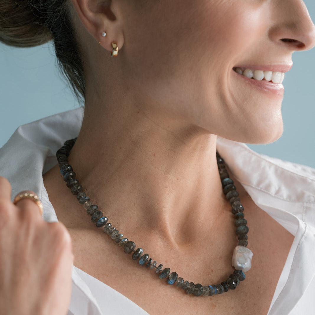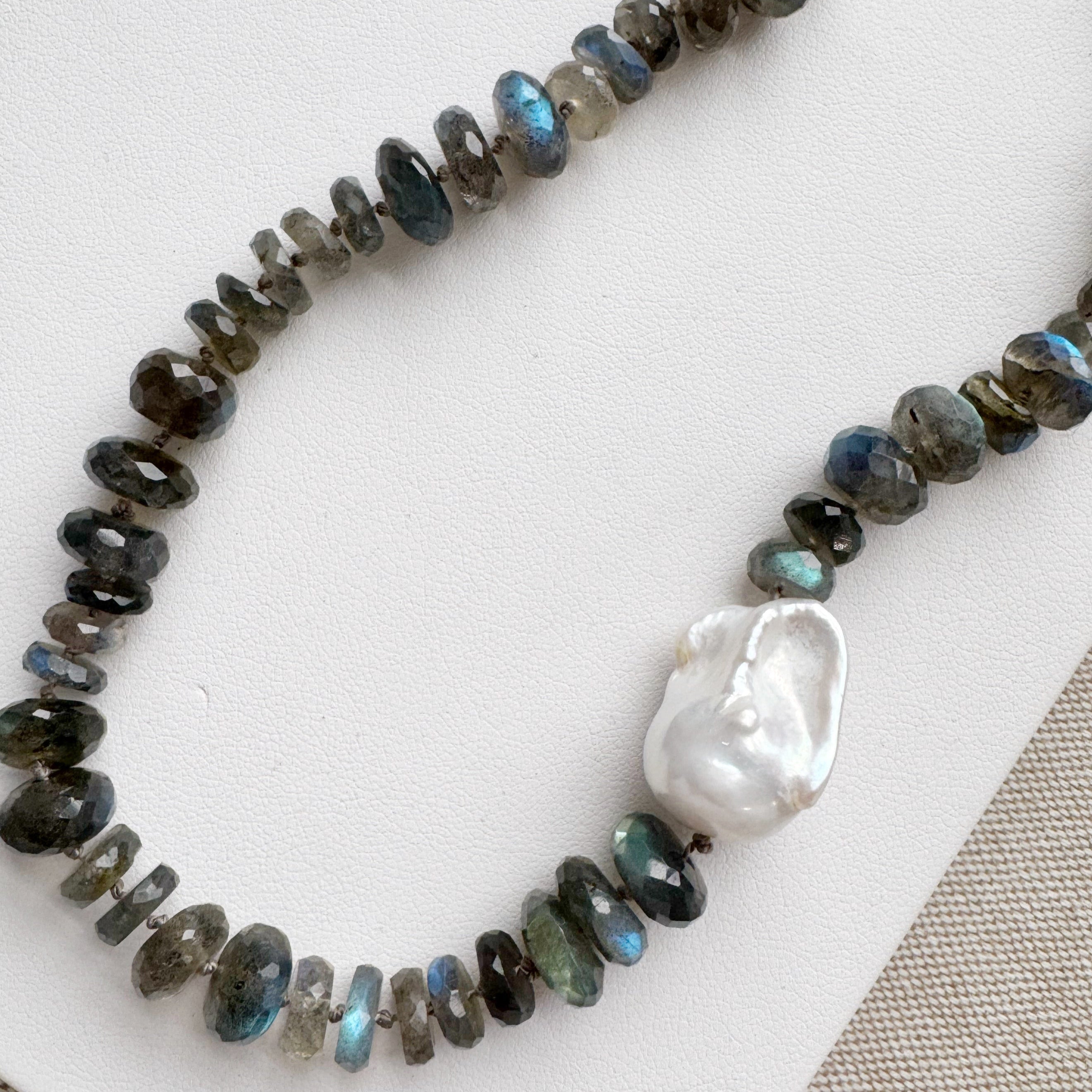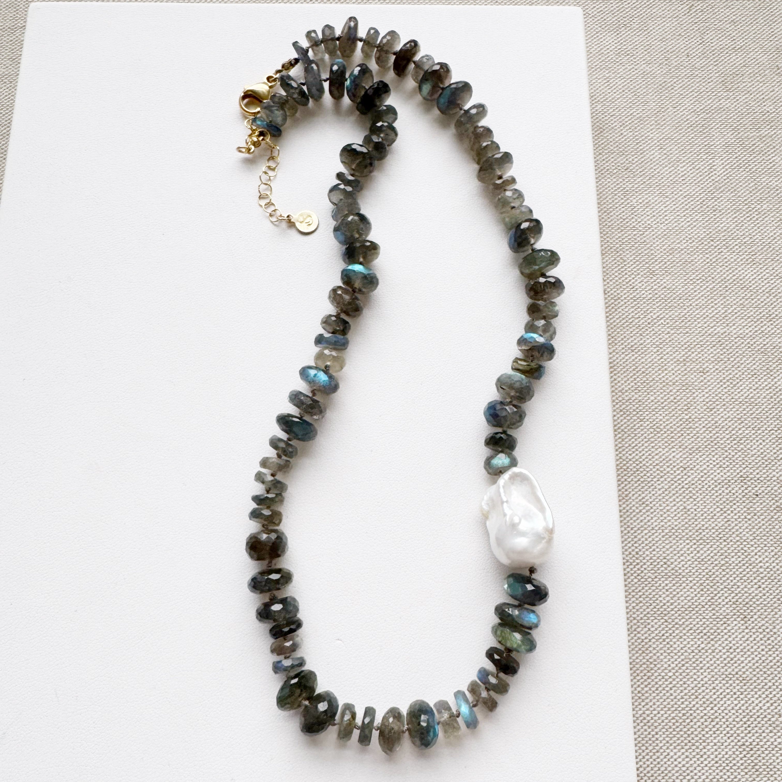 The Saltwater Necklace captures the timeless elegance of pearls and the brilliance of natural gemstones. Each sparkling labradorite stone is knotted by hand on coordinating silk. The mesmerizing flash of these labradorite gemstones is equalled only by the luminous beauty of the large natural freshwater baroque pearl, each one unique and hand picked by Sarah for its shape and radiance.