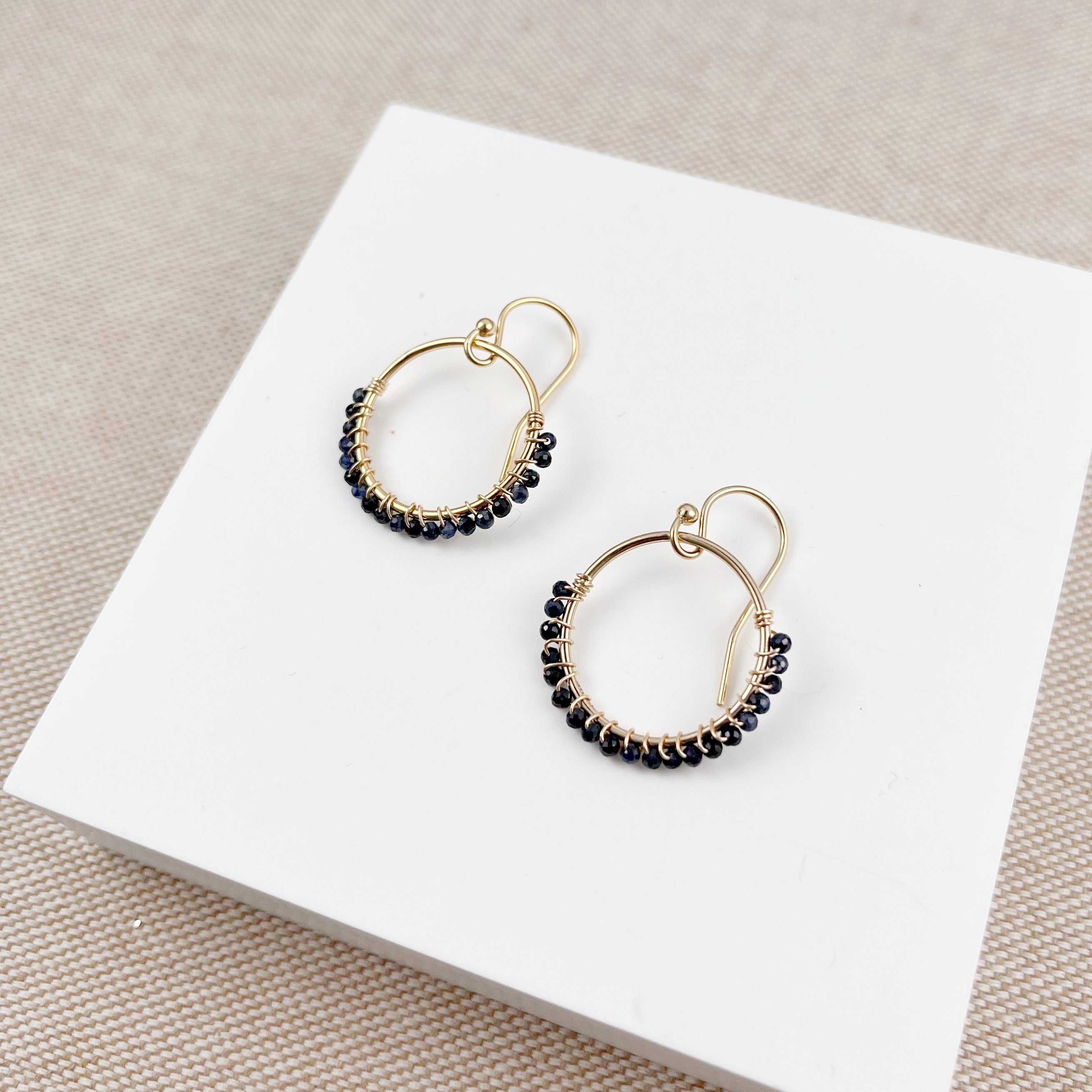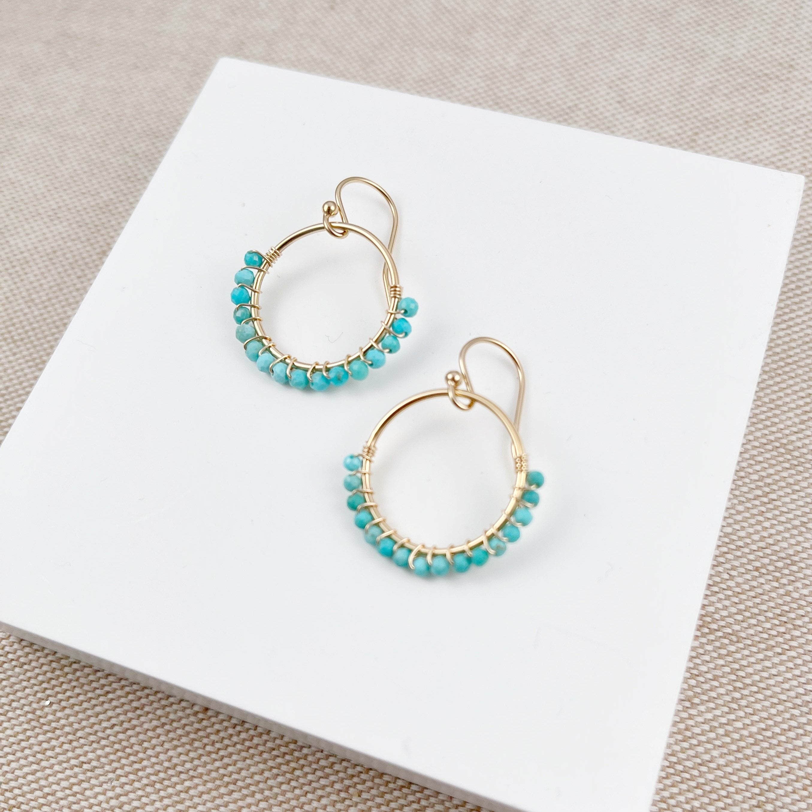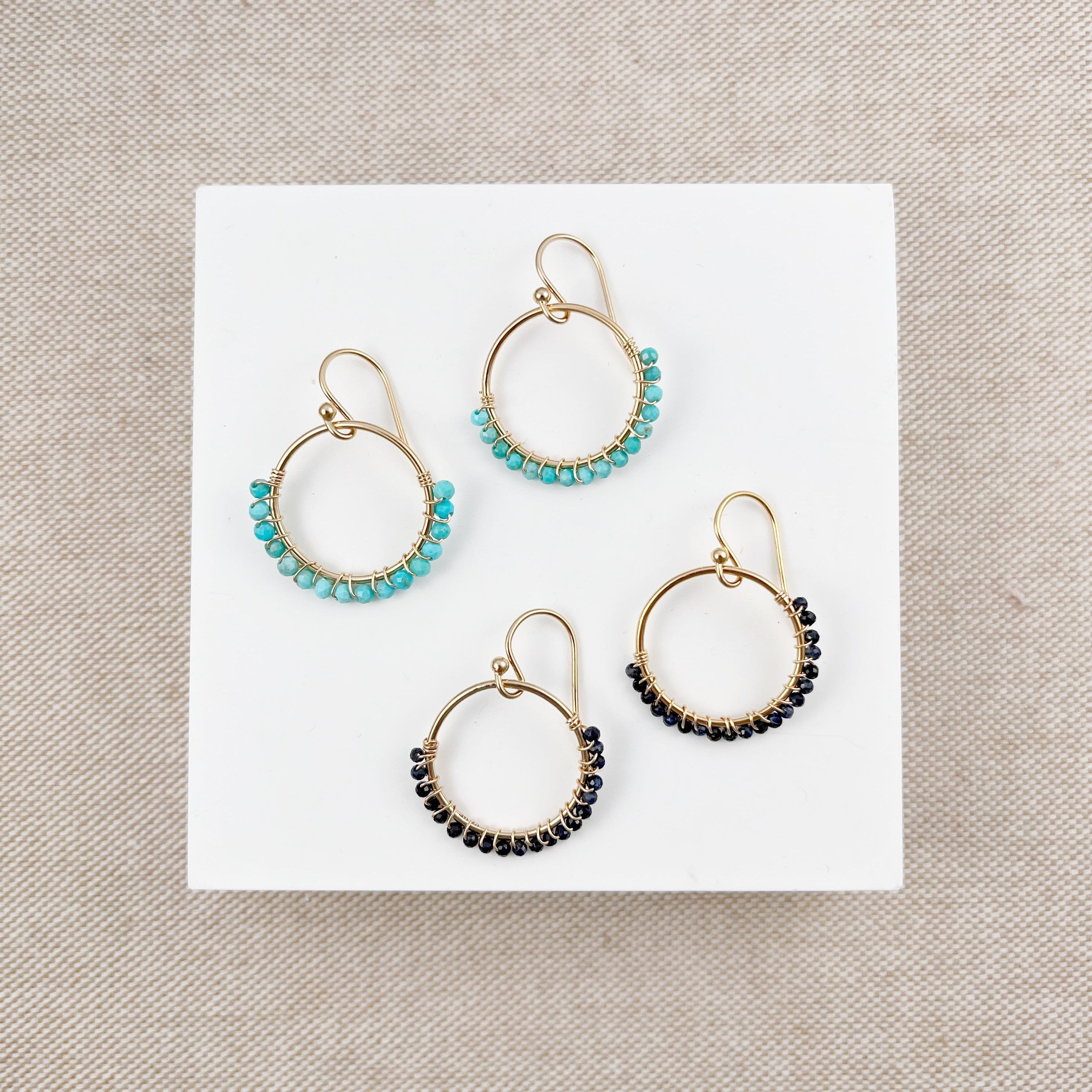 Each 14K gold filled circle of our Isa Earrings is adorned with tiny gemstones, wire wrapped by hand for maximum sparkle. They are the perfect size for elevating your everyday look. Great for gifting to yourself or someone special. Choose from Sapphire or Turquoise.