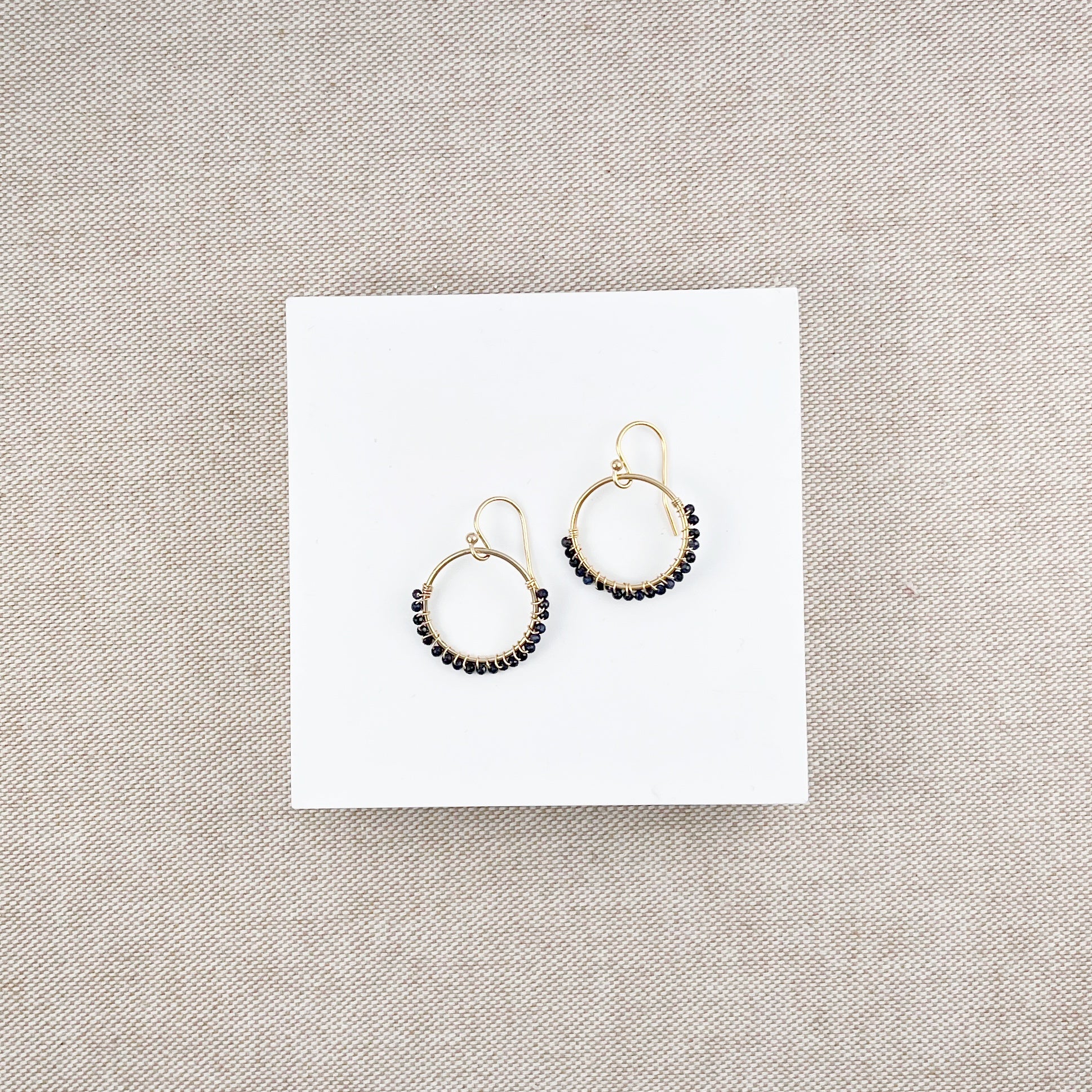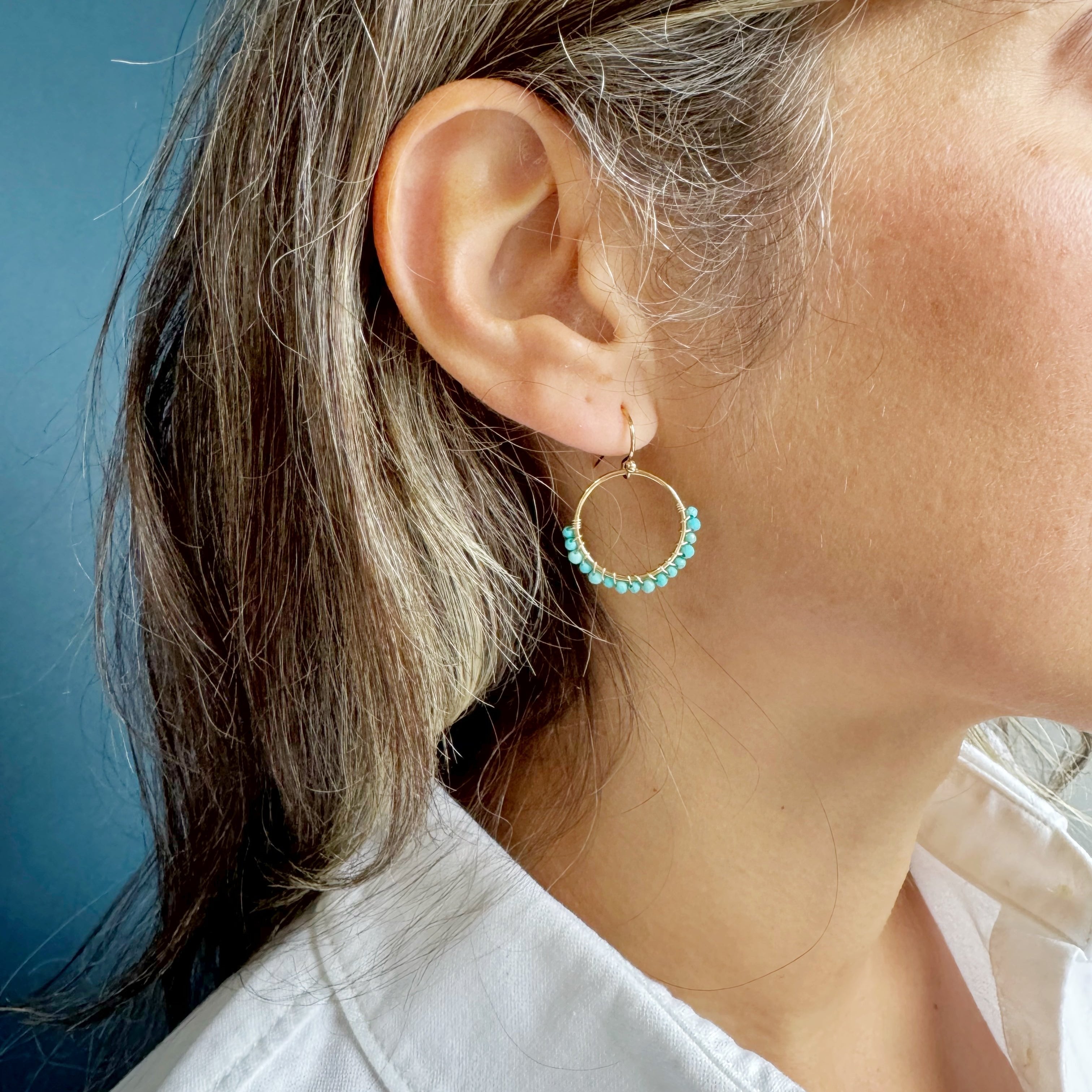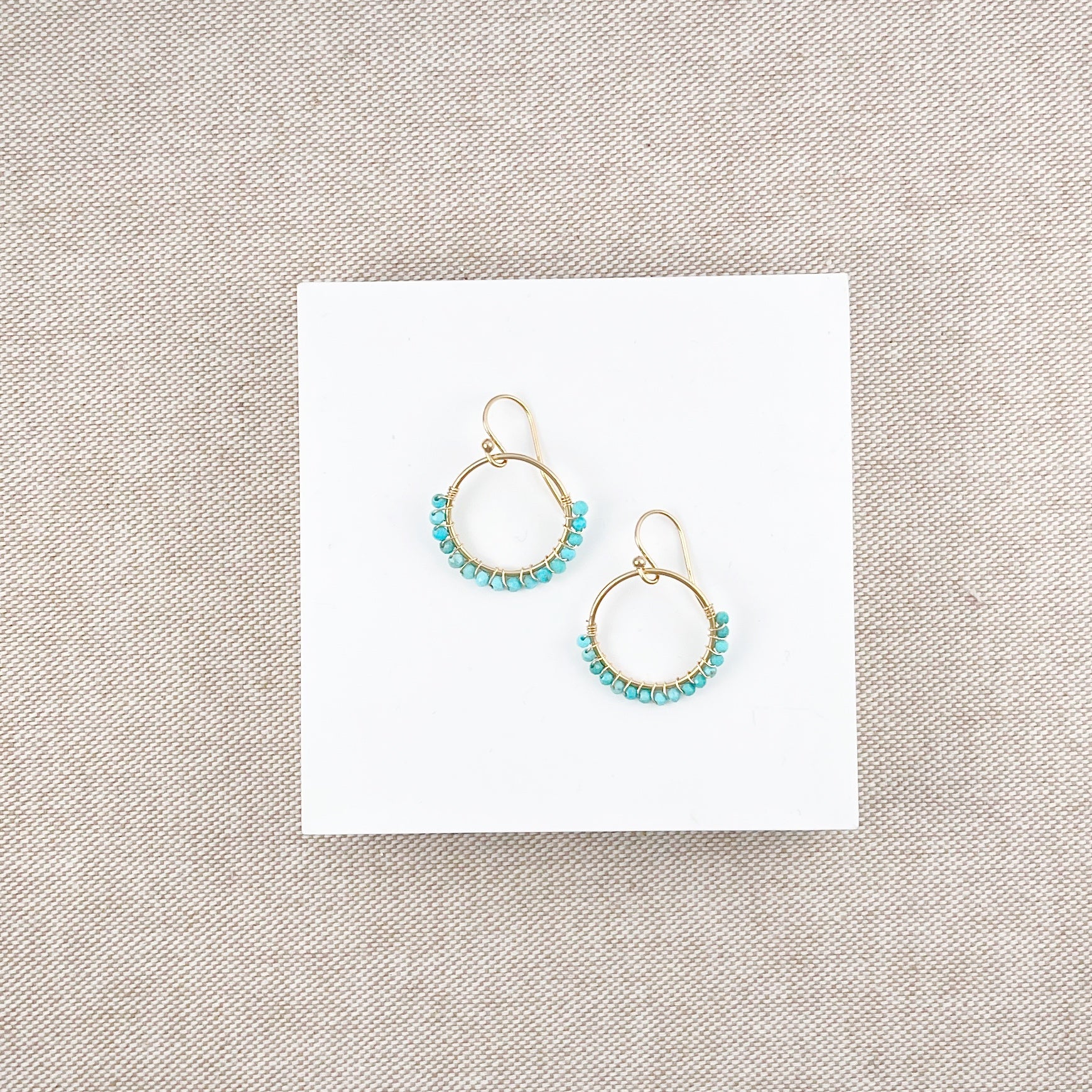 Each 14K gold filled circle of our Isa Earrings is adorned with tiny gemstones, wire wrapped by hand for maximum sparkle. They are the perfect size for elevating your everyday look. Great for gifting to yourself or someone special. Choose from Sapphire or Turquoise.