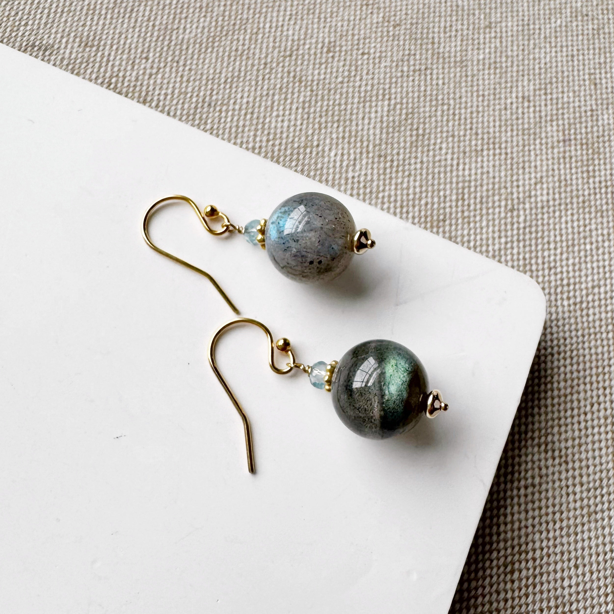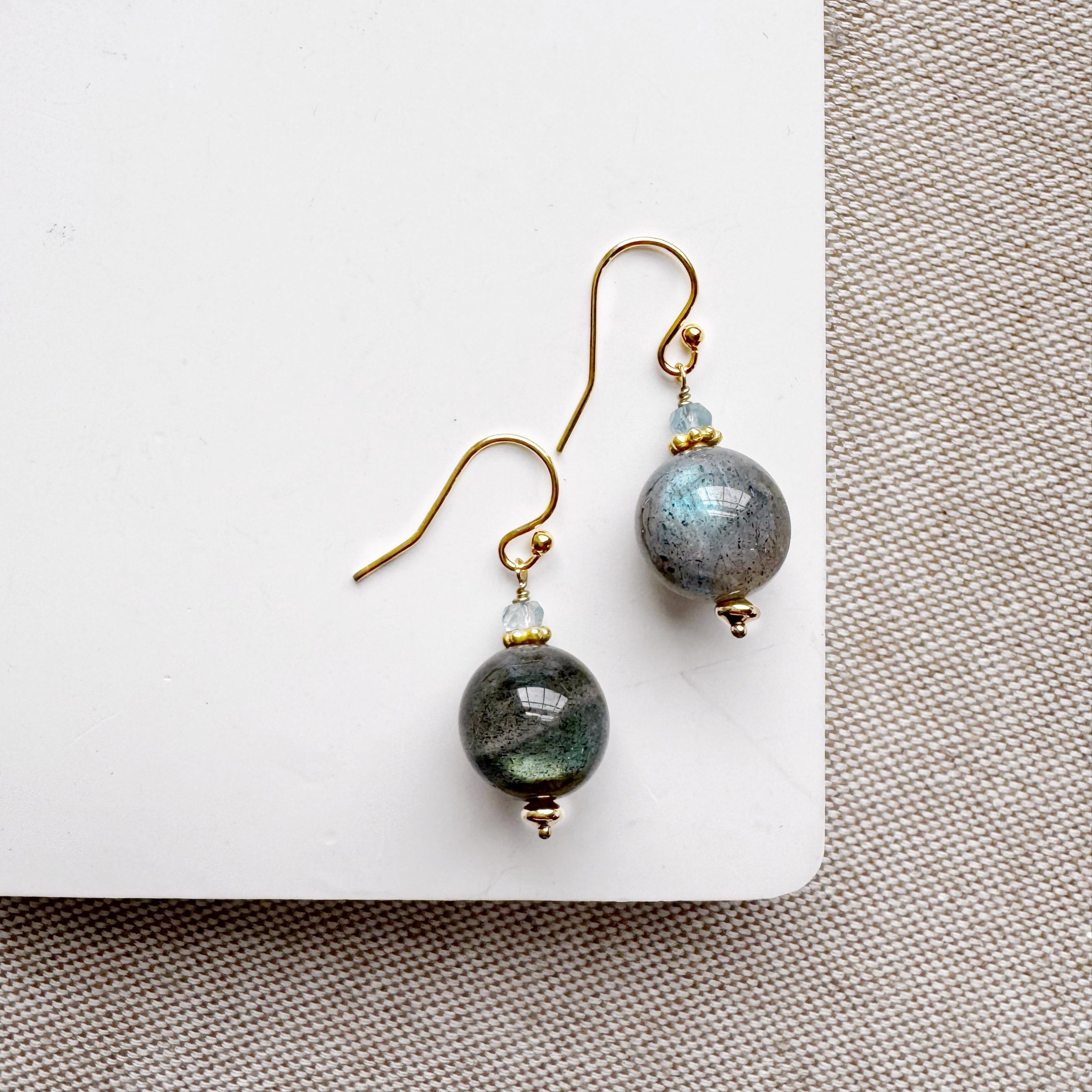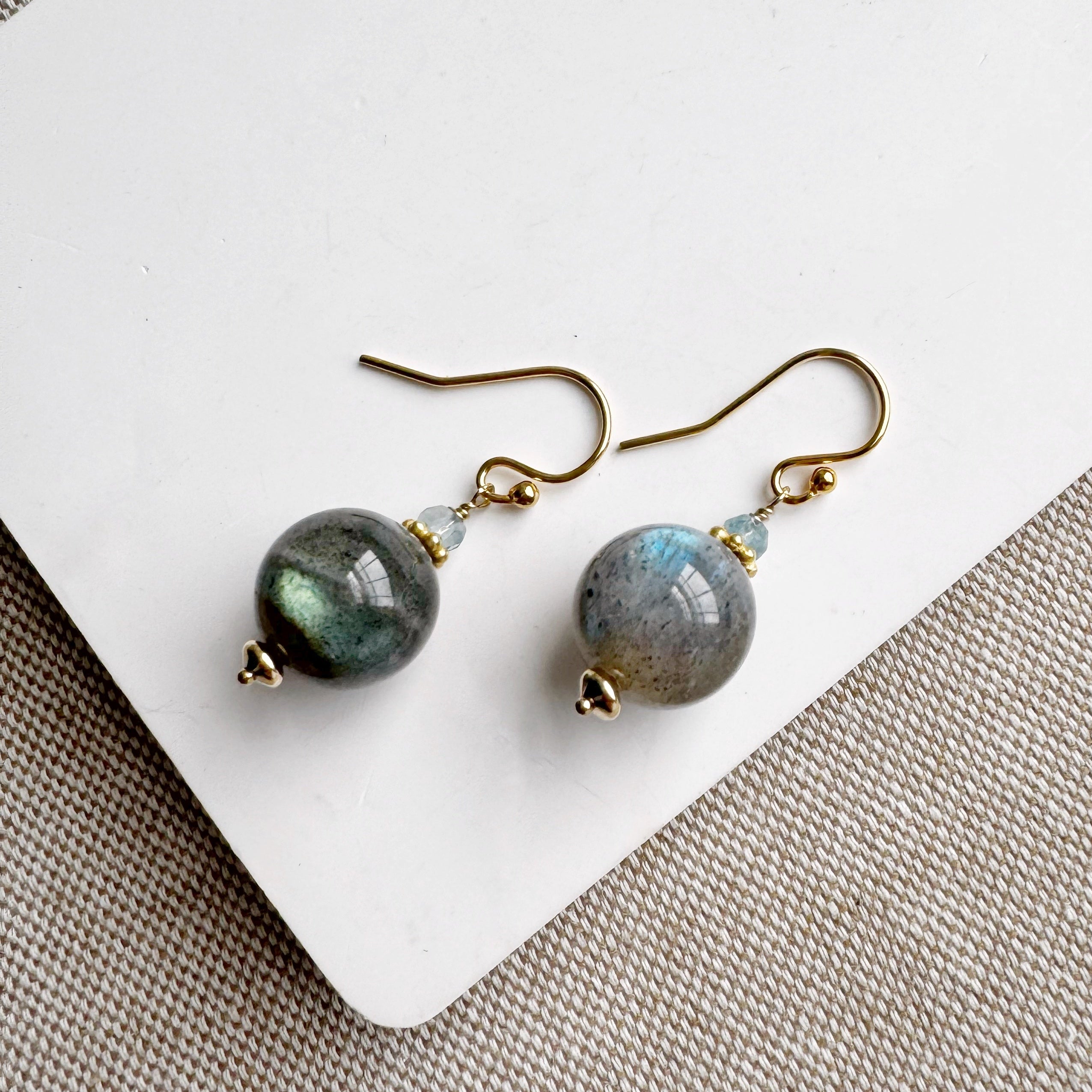 A unique cut, strong flash and shimmering labradorescence makes these labradorite earrings truly special. Gold disc and aquamarine accents up the sparkle factor!