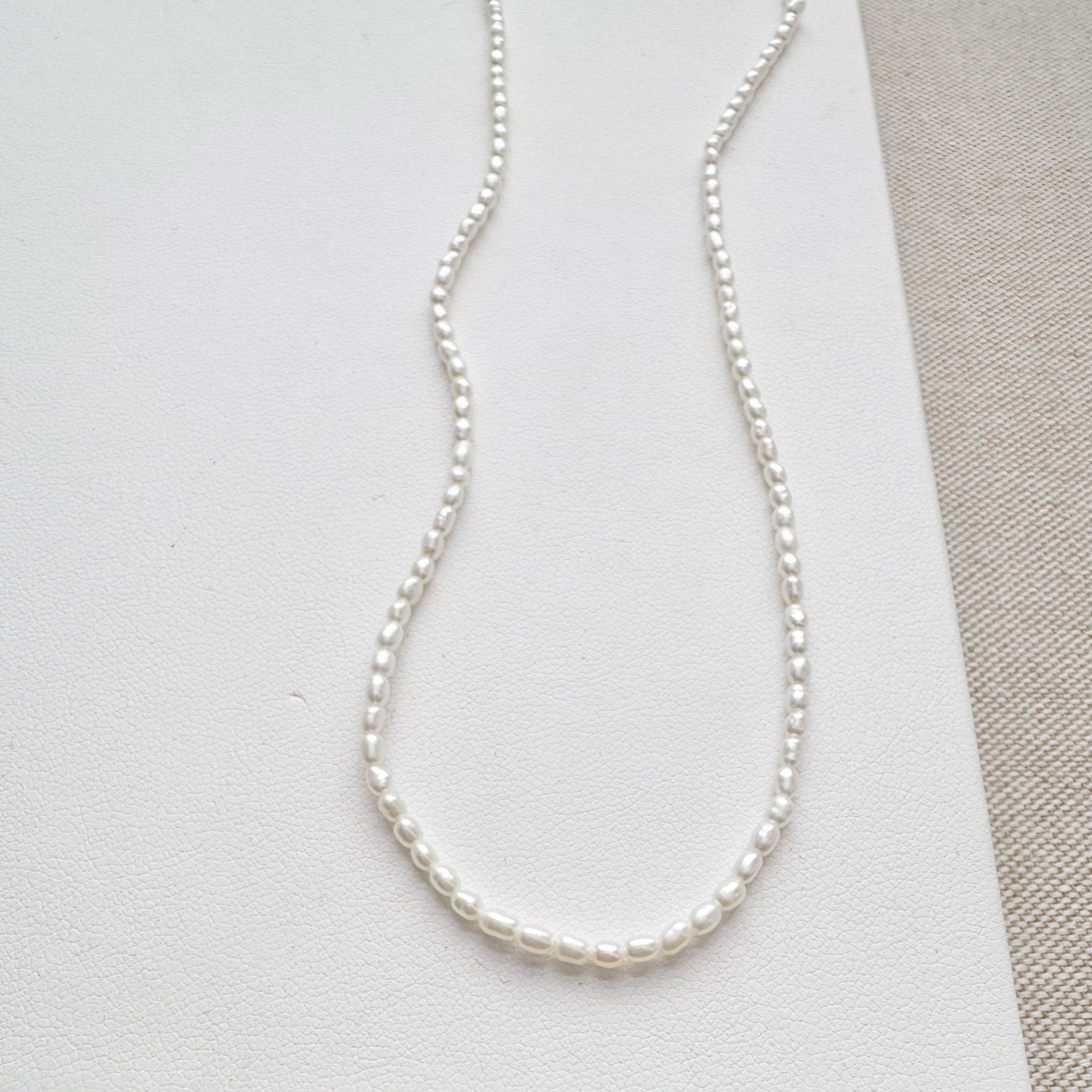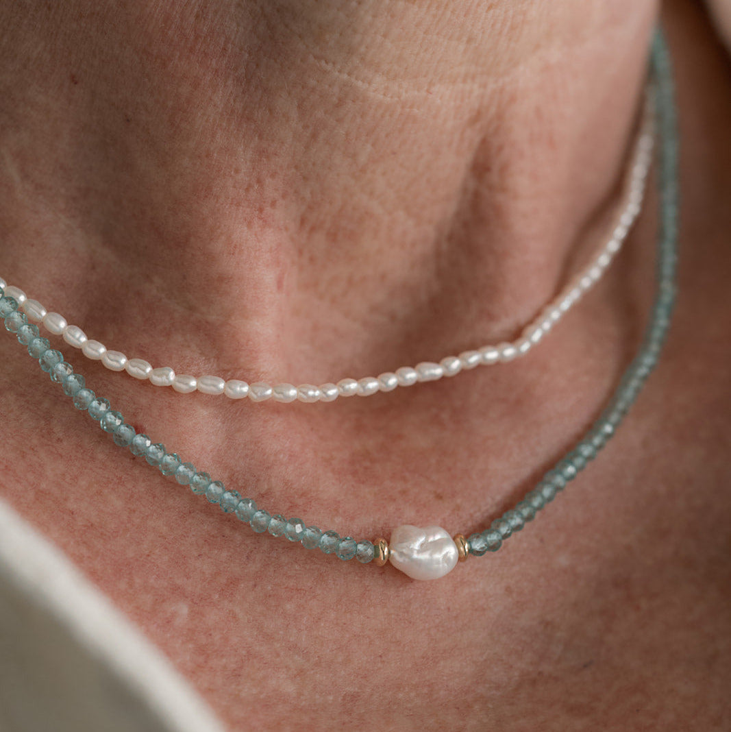 Elegant and understated, our Coastal Necklace features all natural freshwater potato pearls. These pearls are irregular in shape, which gives them a natural and organic feel. You'll notice subtle variations in size and shape from pearl to pearl, a testament to their authentic origin and what makes each necklace truly one-of-a-kind. Their surface shimmers with a soft, natural luster, reflecting the light. A shorter length makes this an ideal piece for layering or for complimenting higher necklines. You'll find yourself reaching for this piece all the time, as it mixes and matches so well with all your favorites!
