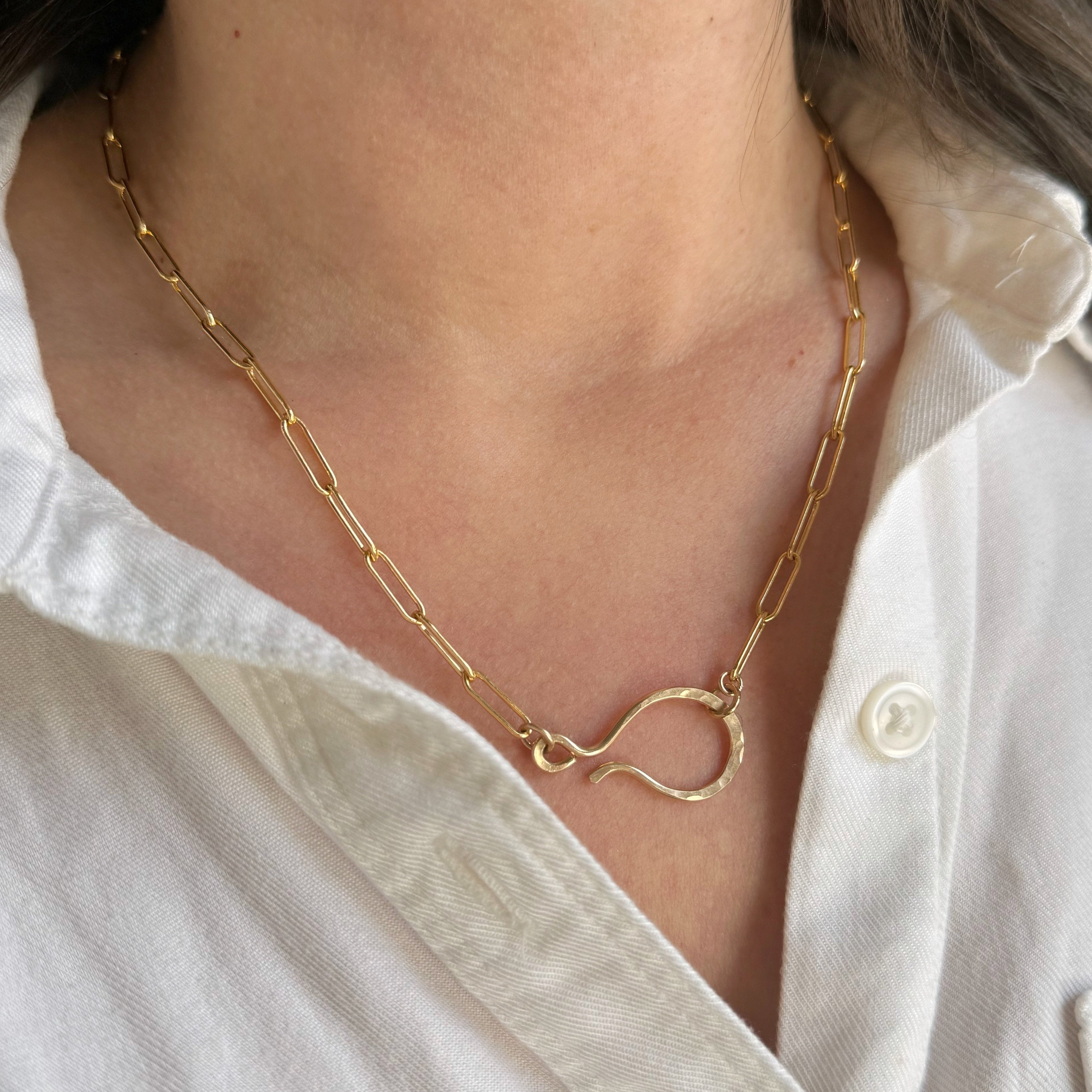 A modern, handmade, oversized front clasp, custom designed in-house, is shaped and hammered by hand by our skilled makers to create the stunning centerpiece of this exquisite statement necklace. The Ayla Necklace is exclusive to Sarah Cornwell. A sleek, minimalist design that you won't find anywhere else - you can wear it on it's own for a chic, understated look or pair it with our strung and knotted gemstone necklaces for a modern layered look. You will not be disappointed with this special piece, a subtle blend of classic elegance and contemporary style, perfect for the trendsetter who appreciates the finer things.
