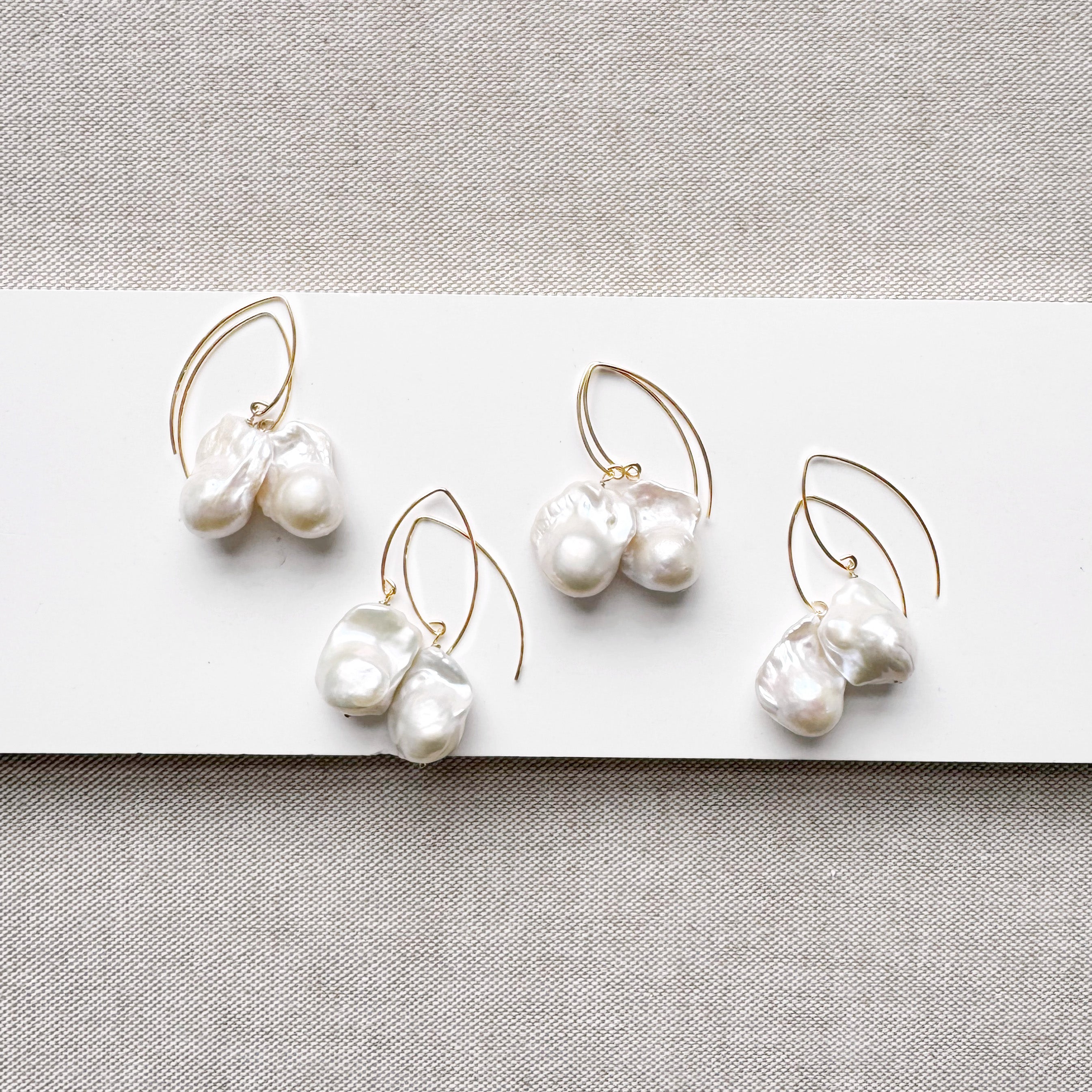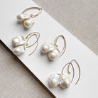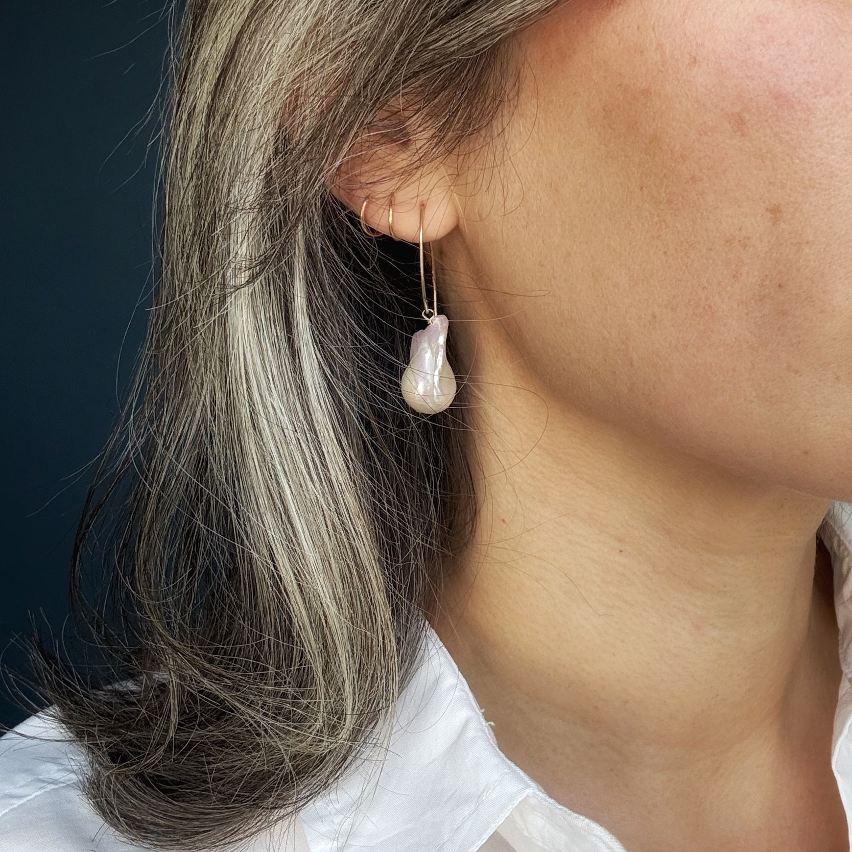 The pearls dangle from artistic, elongated v-wire hooks—a thoughtful design choice that adds architectural balance while allowing the incredible pearls to take center stage. These are the earrings you wear when you want to feel elevated, artistic, and entirely original.