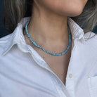 The rarity of this piece cannot be overstated. Sourced from the Altyn Tyube mine, where miners can only work during the freezing winter months to navigate the treacherous terrain, the mining process ensures that every stone in this strand is a hard-won prize from the Kazakh landscape. These stones represent the highest level of chemical purity and because no two stones share the same matrix or exact hue, this strand is entirely unique—a continuous flow of mesmerizing powder blue and turquoise, punctuated by a dramatic, chocolate-colored matrix.