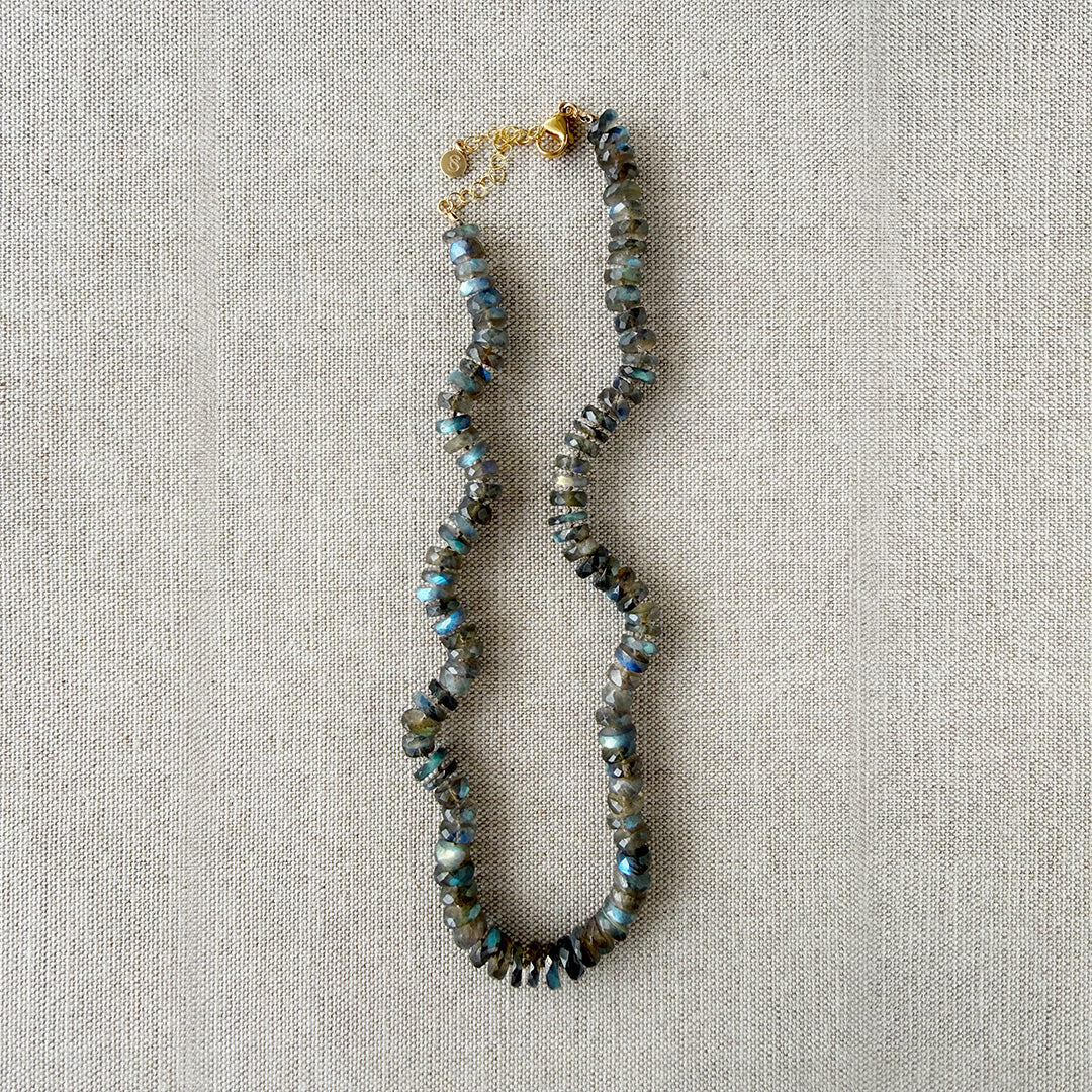 Labradorite is a stone of mystery and transformation, known for its "labradorescence"—that hidden, internal fire that reveals itself as you move. We’ve chosen just the right faceted cut to ensure these stones catch every bit of light, throwing back sudden, brilliant flashes of electric blue, forest green, and deep violet. The prominent scale and cut of these gemstones give the necklace luxurious texture and a substantial silhouette.