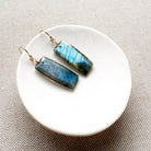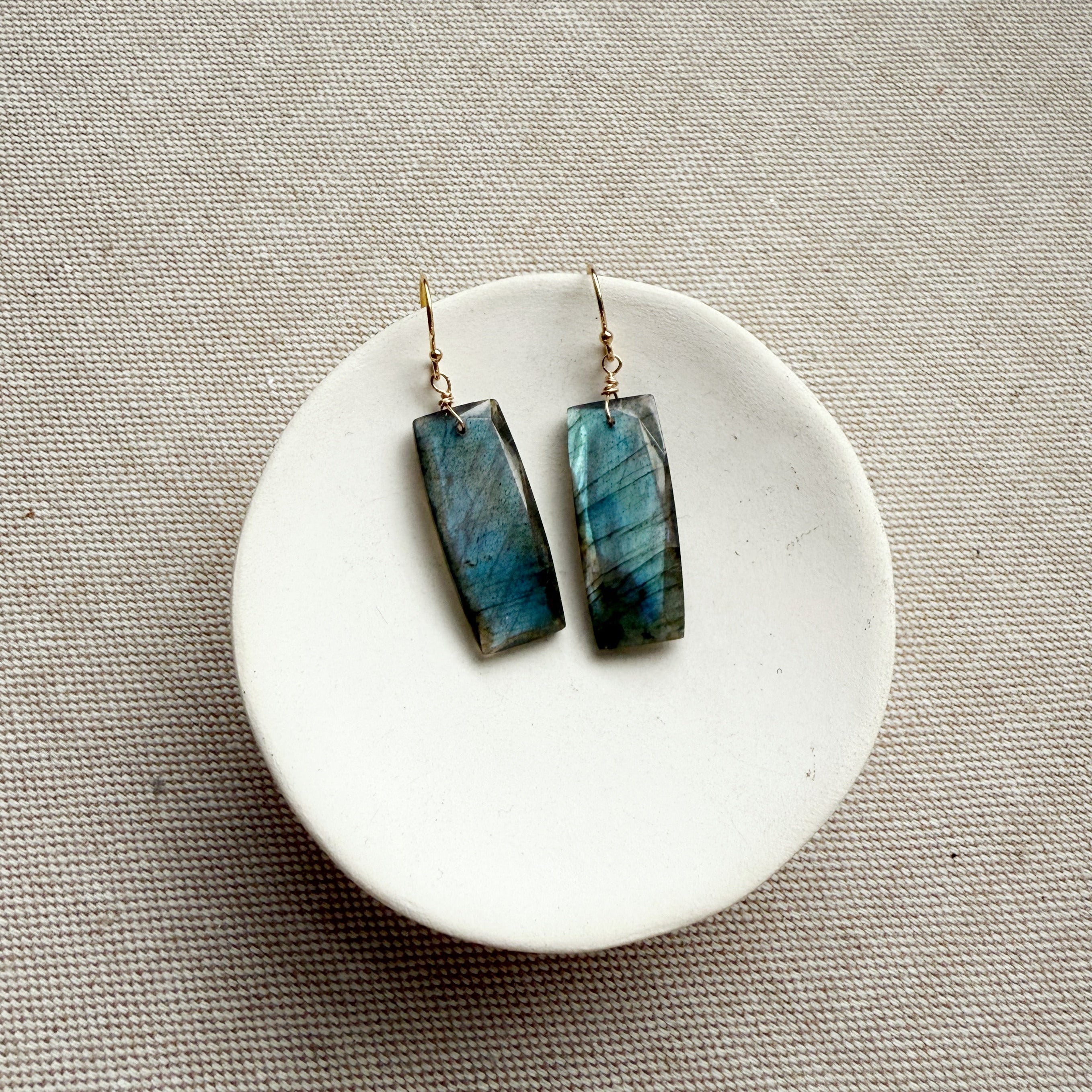 Our Rosemary Earrings bring the signature stormy flash of labradorite to all your looks, with labradorite gemstones in a stunning beveled rectangle cut. These earrings will turn heads when you walk into the room and be your secret weapon for being event ready.