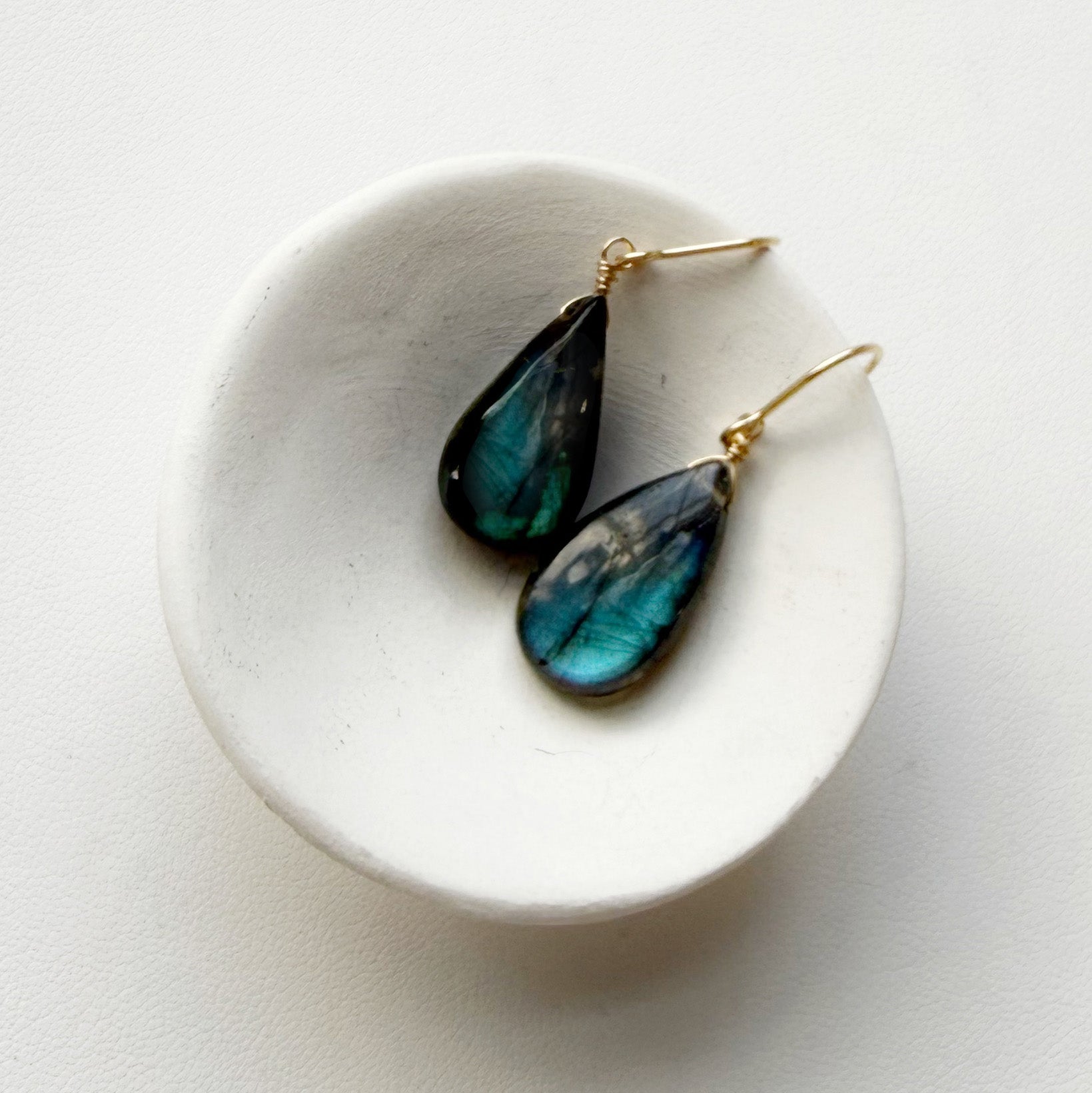 Elevate your "everyday" with the Skyline Teardrop Earrings. Featuring stunning, large labradorite gemstones, these earrings are polished to a smooth finish to showcase the stone's incredible natural flash.