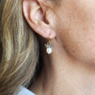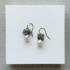 A cluster of labradorite gemstones are set atop a perfect creamy white natural freshwater pearl drop.