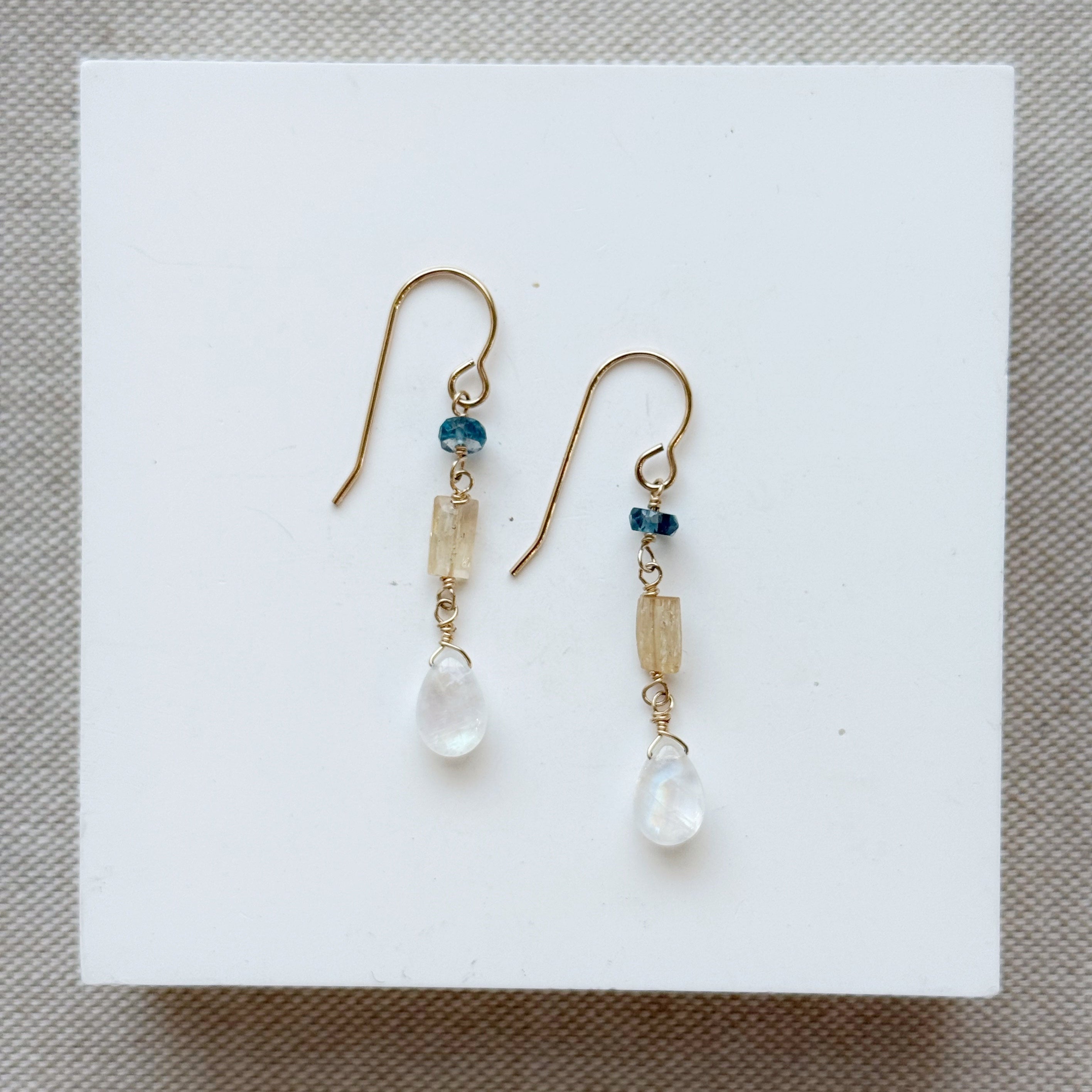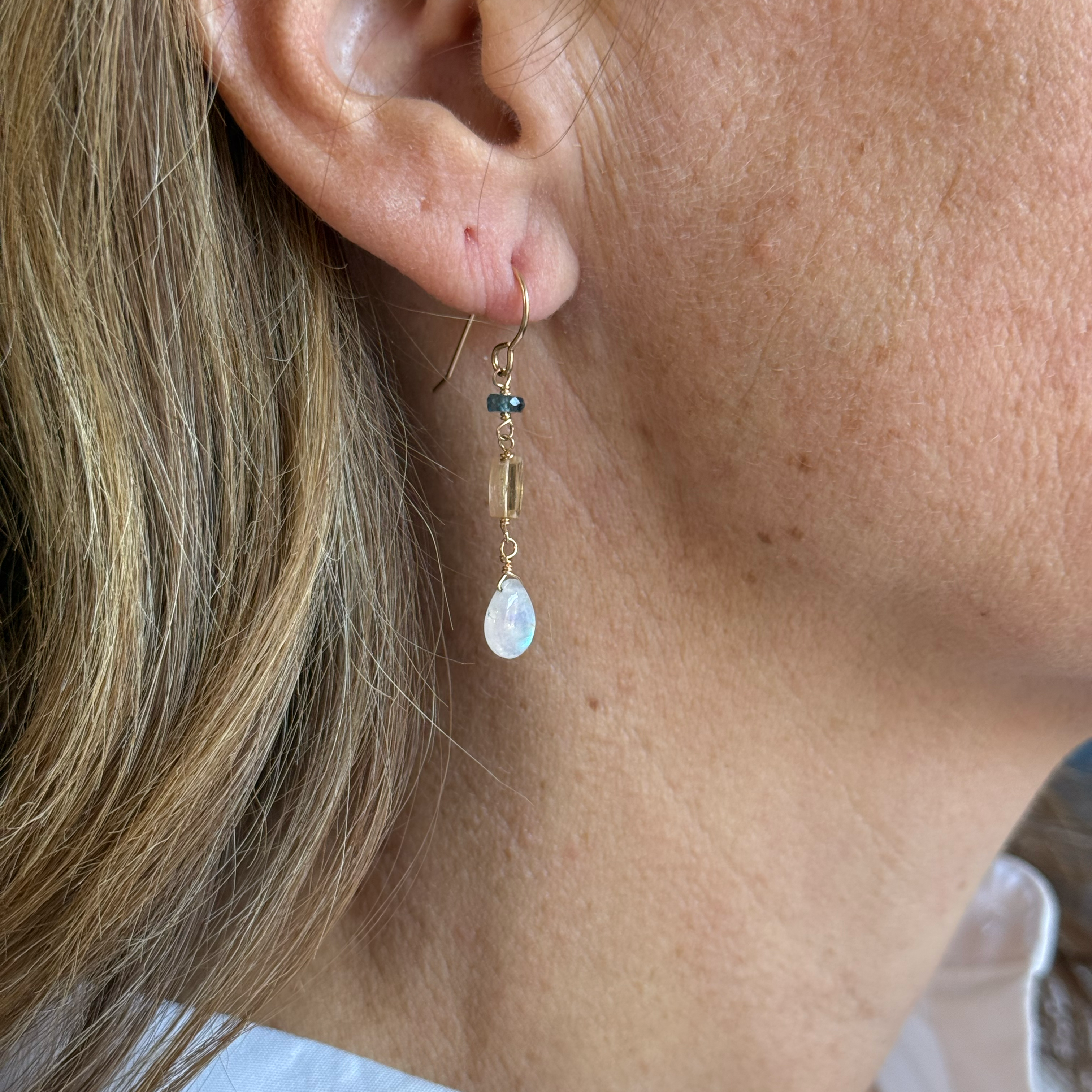 London blue topaz and imperial topaz are wire-wrapped by hand for you with shimmery smooth cut teardrop shaped moonstones. Sure to be the pair you reach for when you need a bit of sparkle!