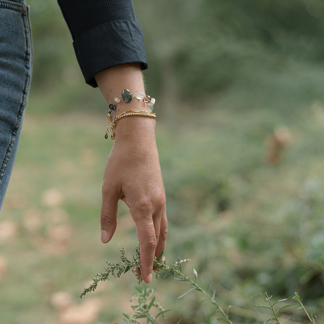 The Bliss Bracelet mixes iolite (promotes inner peace and enhanced intuition), prehnite (promotes calm and emotional healing), labradorite (shields against negative energy), aqua kyanite (emotional balance), smoky quartz (stress relief), london blue topaz (improves clarity & focus), moonstone (sleep improvement) and keshi pearls (stress reduction and inner peace), wire-wrapped by hand for you by our makers in our Doylestown, PA studio. The result is a beautifully composed piece that celebrates the essence of each individual gemstone, but also the harmony created when they are all wire-wrapped together.