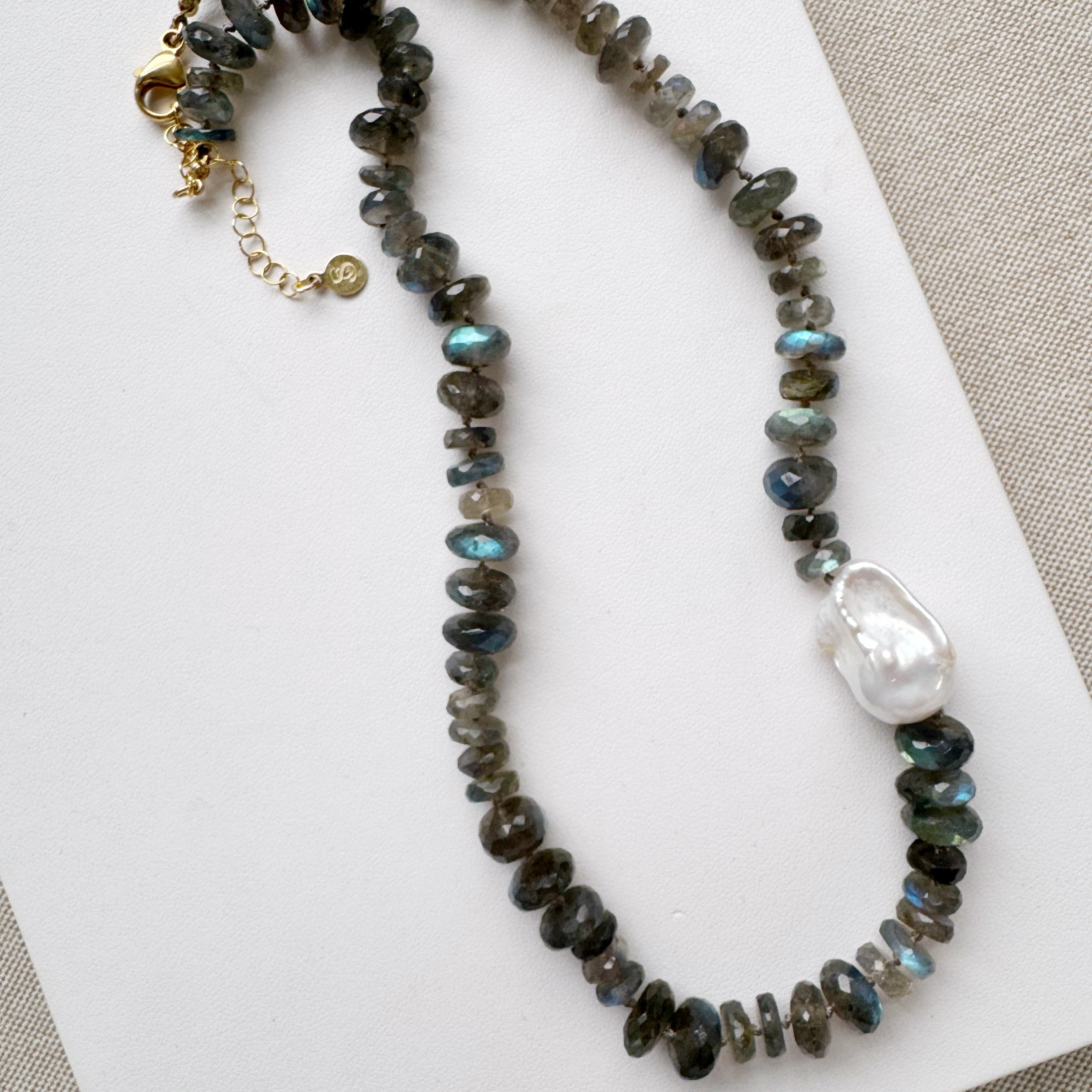 The Saltwater Necklace captures the timeless elegance of pearls and the brilliance of natural gemstones. Each sparkling labradorite stone is knotted by hand on coordinating silk. The mesmerizing flash of these labradorite gemstones is equalled only by the luminous beauty of the large natural freshwater baroque pearl, each one unique and hand picked by Sarah for its shape and radiance.
