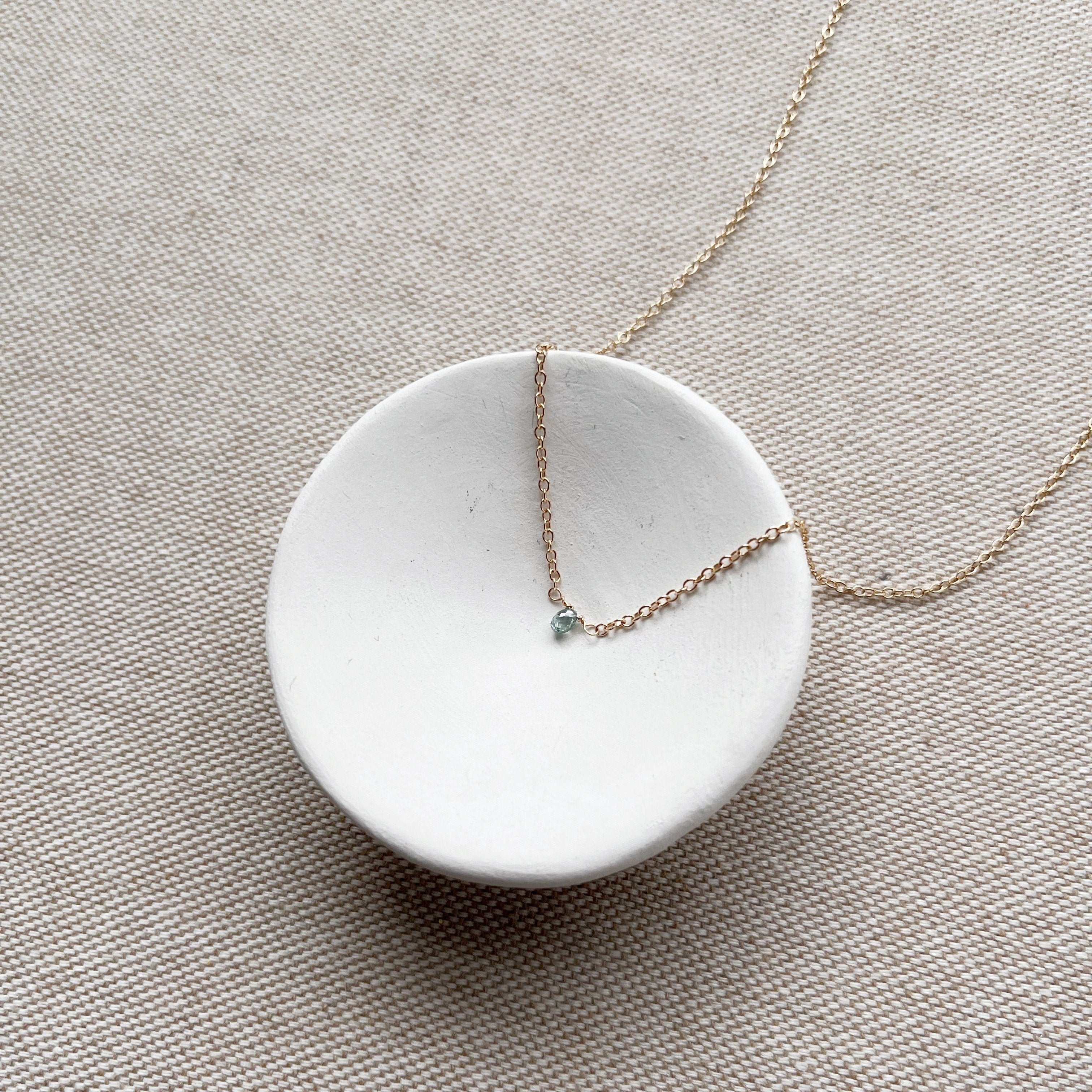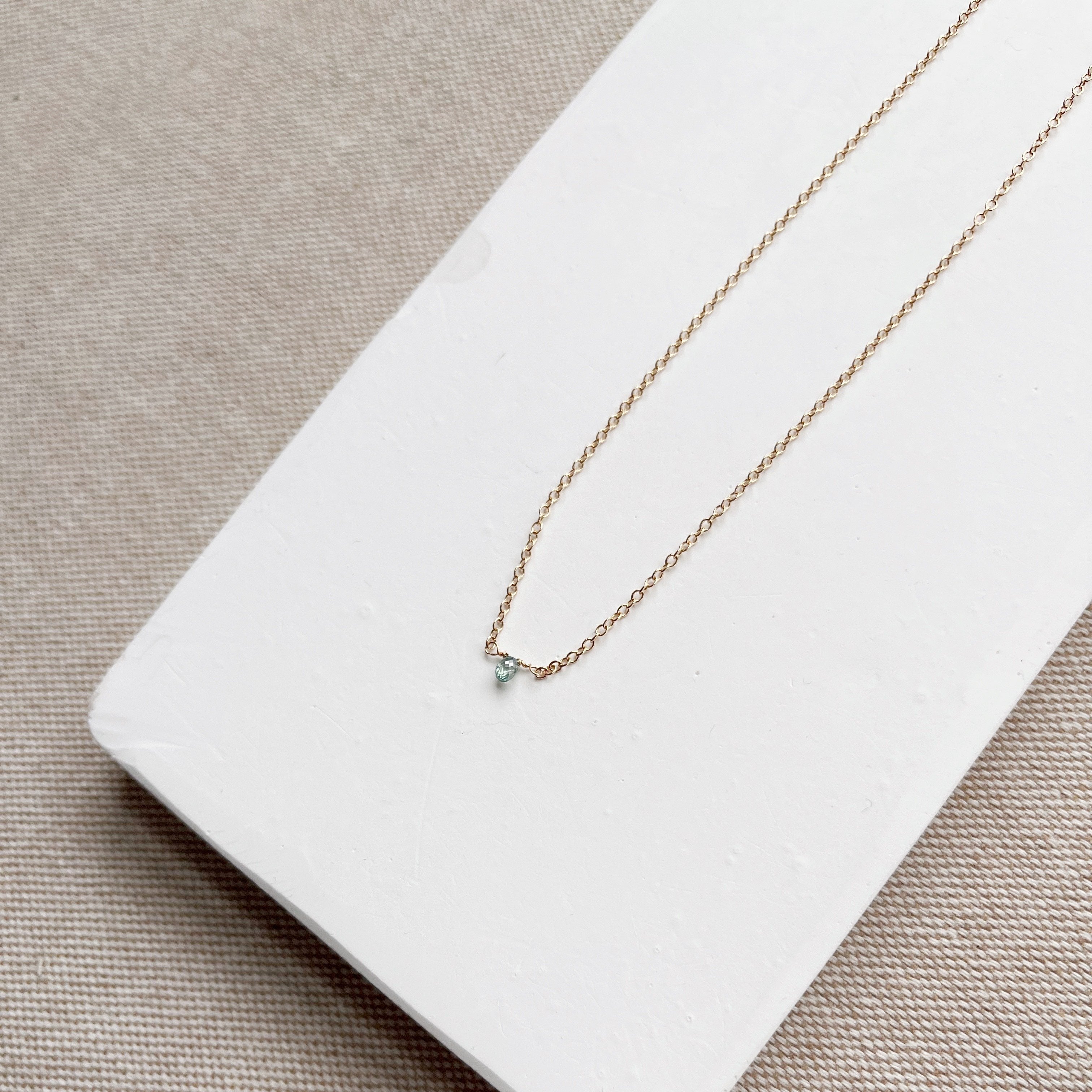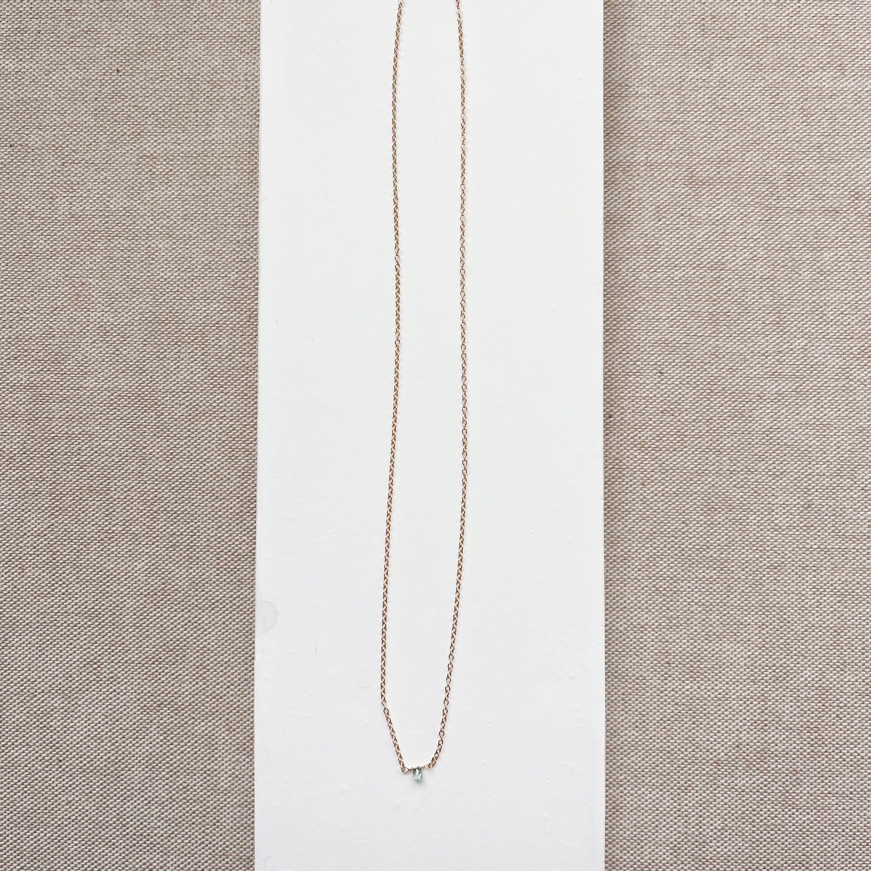 A single diamond drops in a beautiful shade of light aqua blue. Dainty and shimmery, you will quickly fall in love with the Starling Necklace in solid gold.