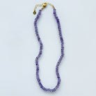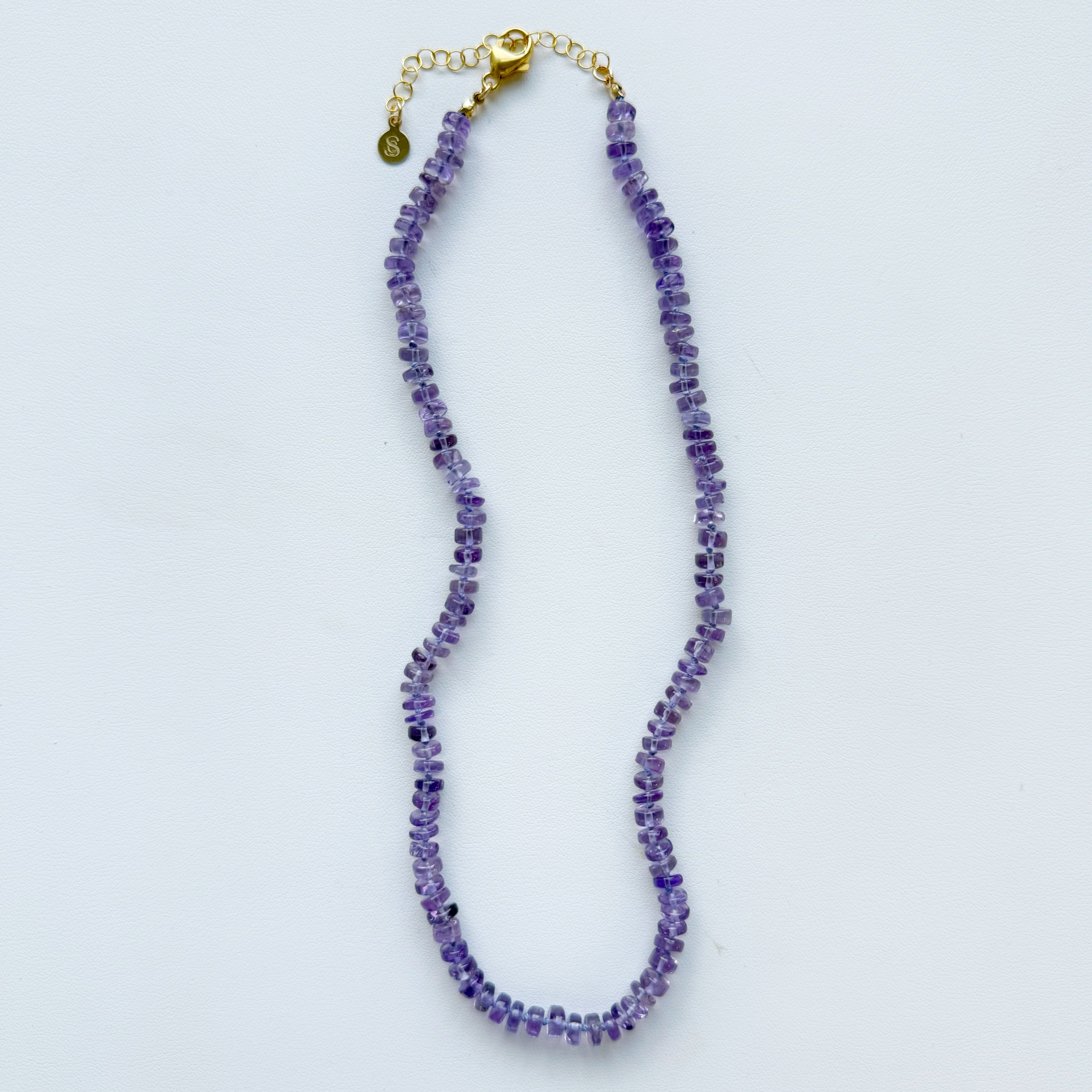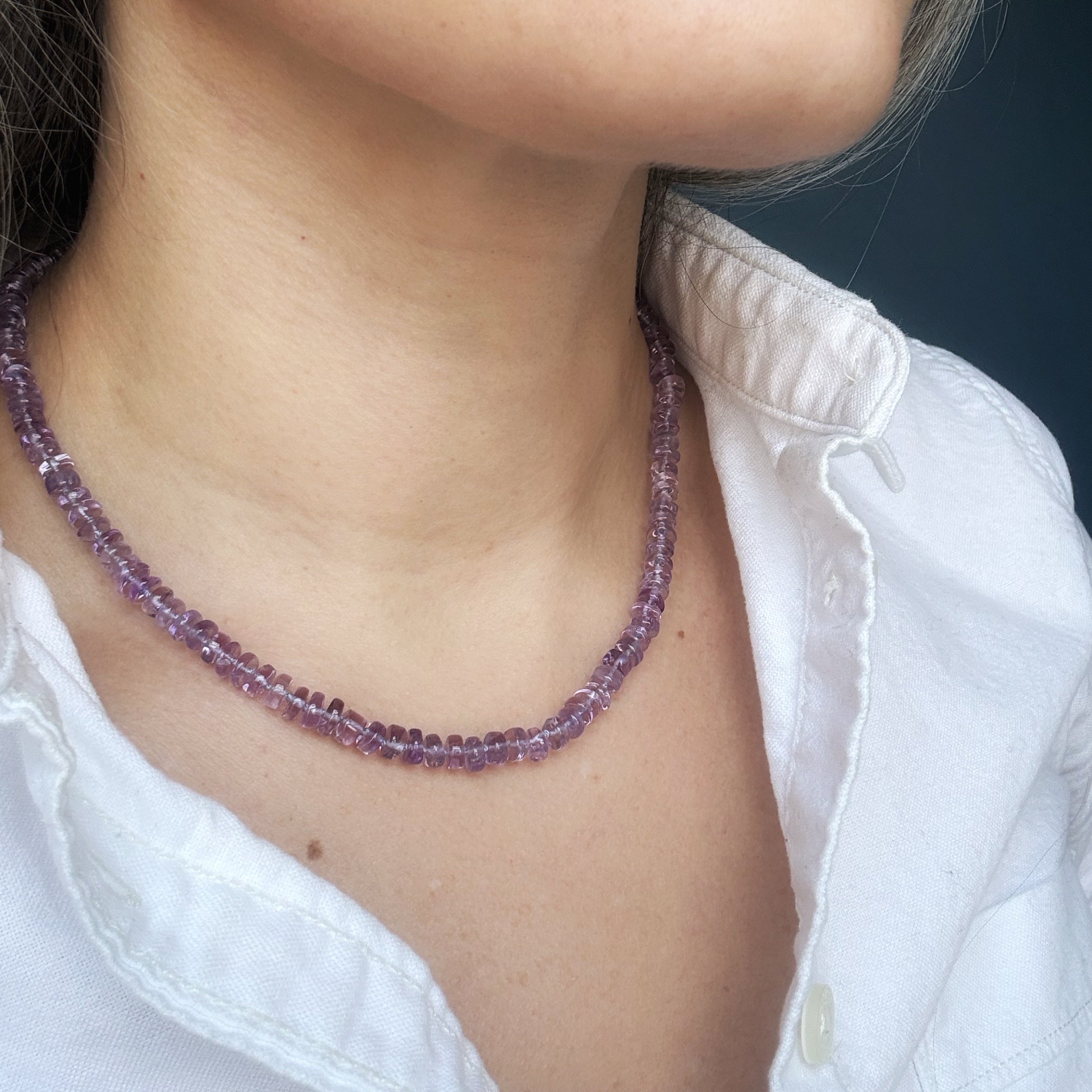 Amethysts in a beautiful shade of lilac are knotted by hand for you by our makers. Coordinating silk makes the gorgeous color pop!