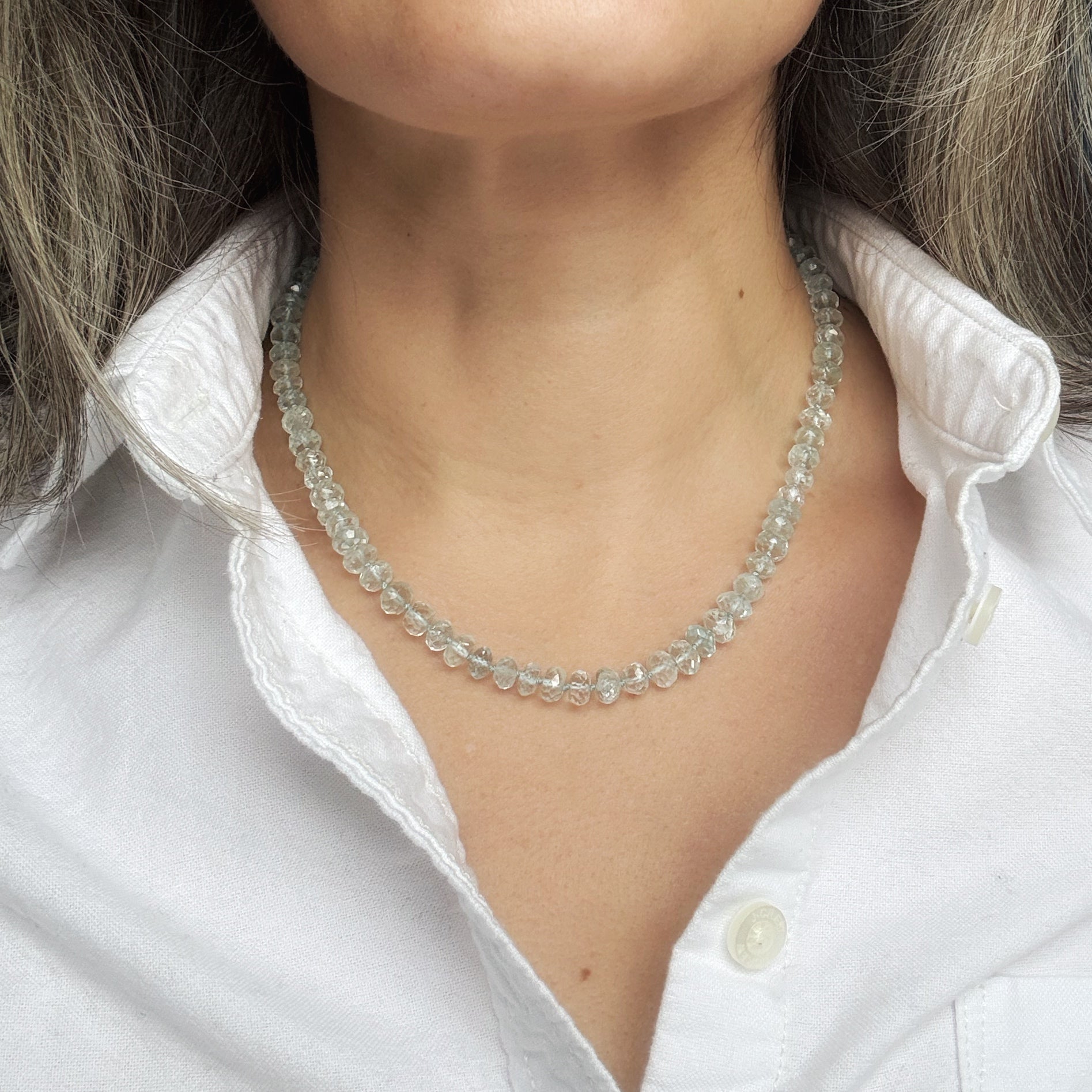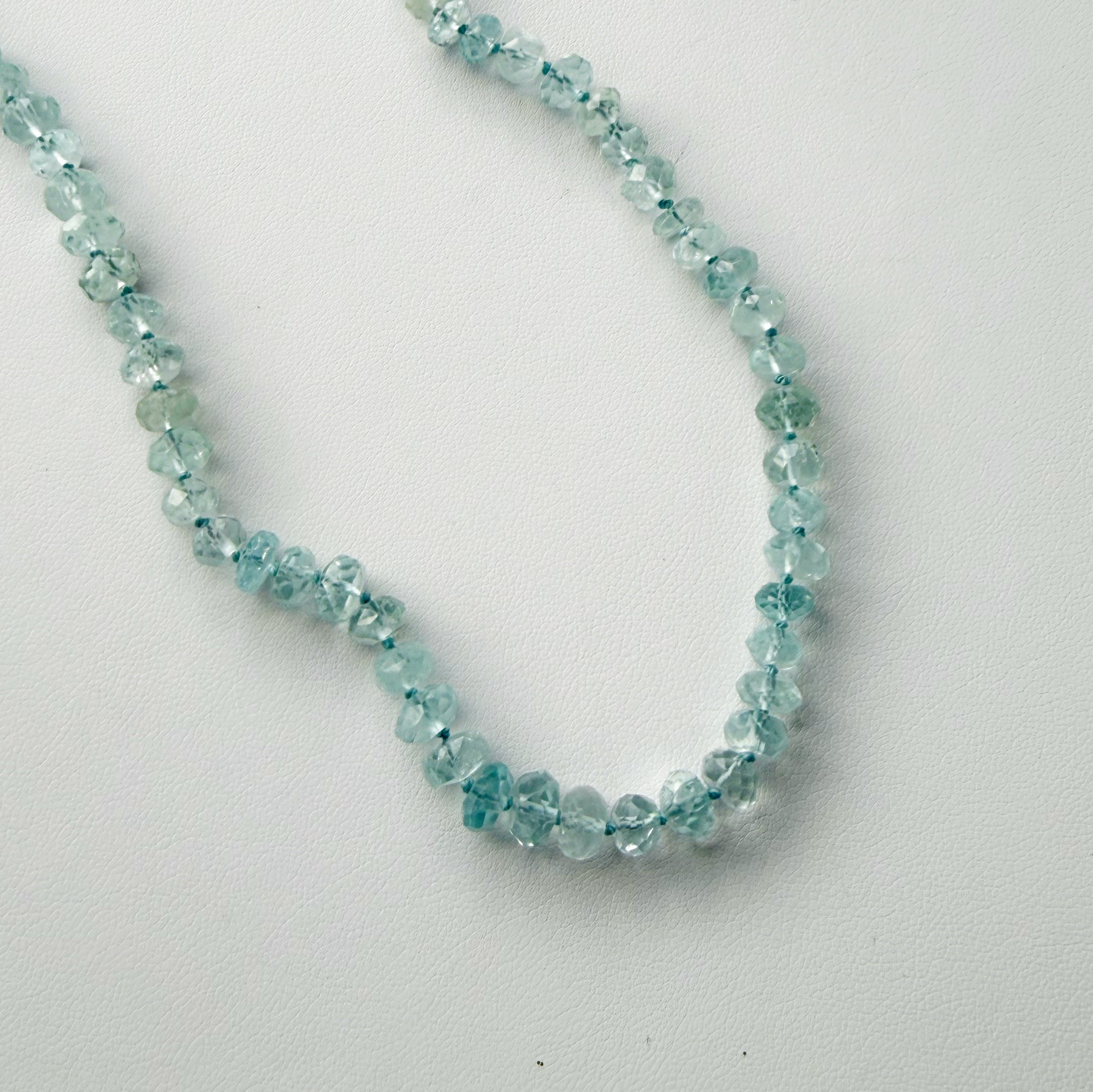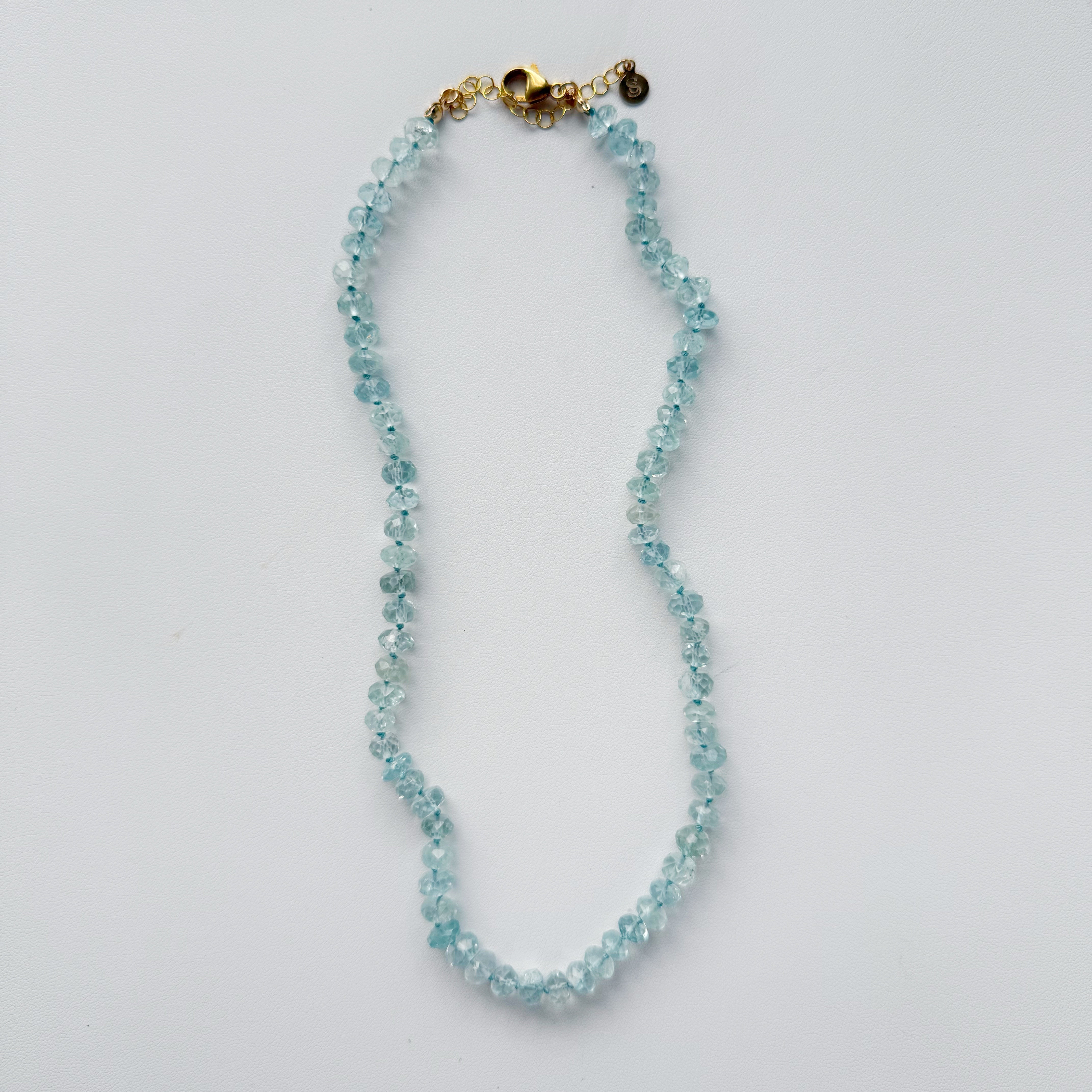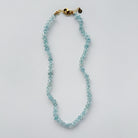 Blue topaz is knotted by hand on sky blue silk to highlight the beautiful color and sparkle.