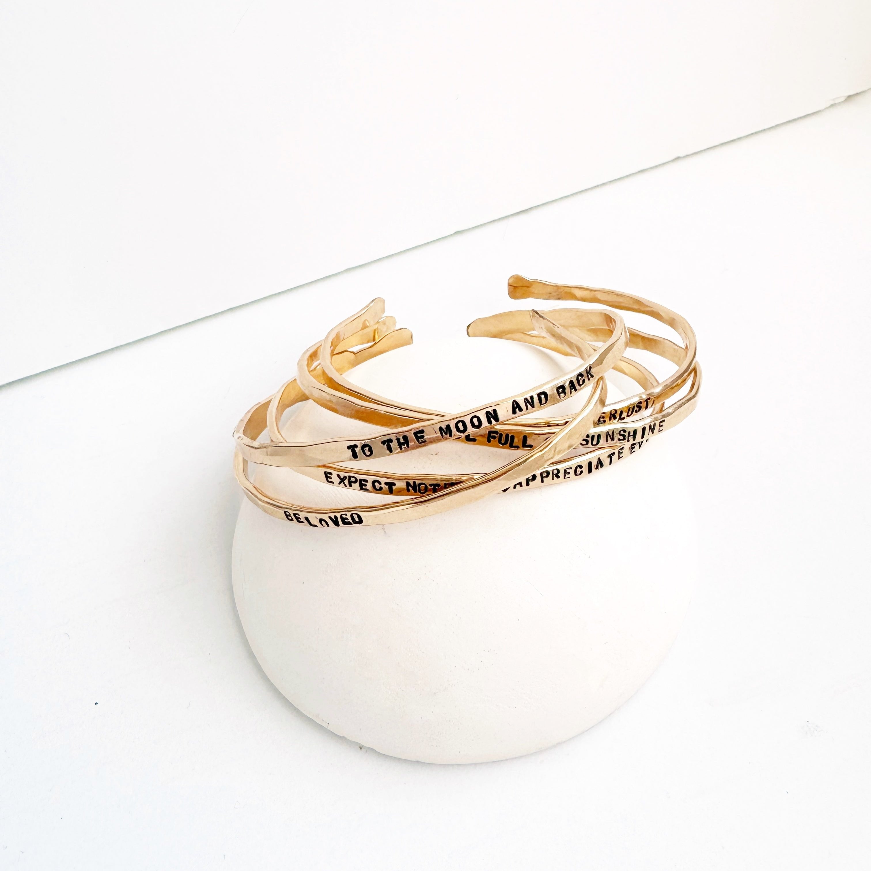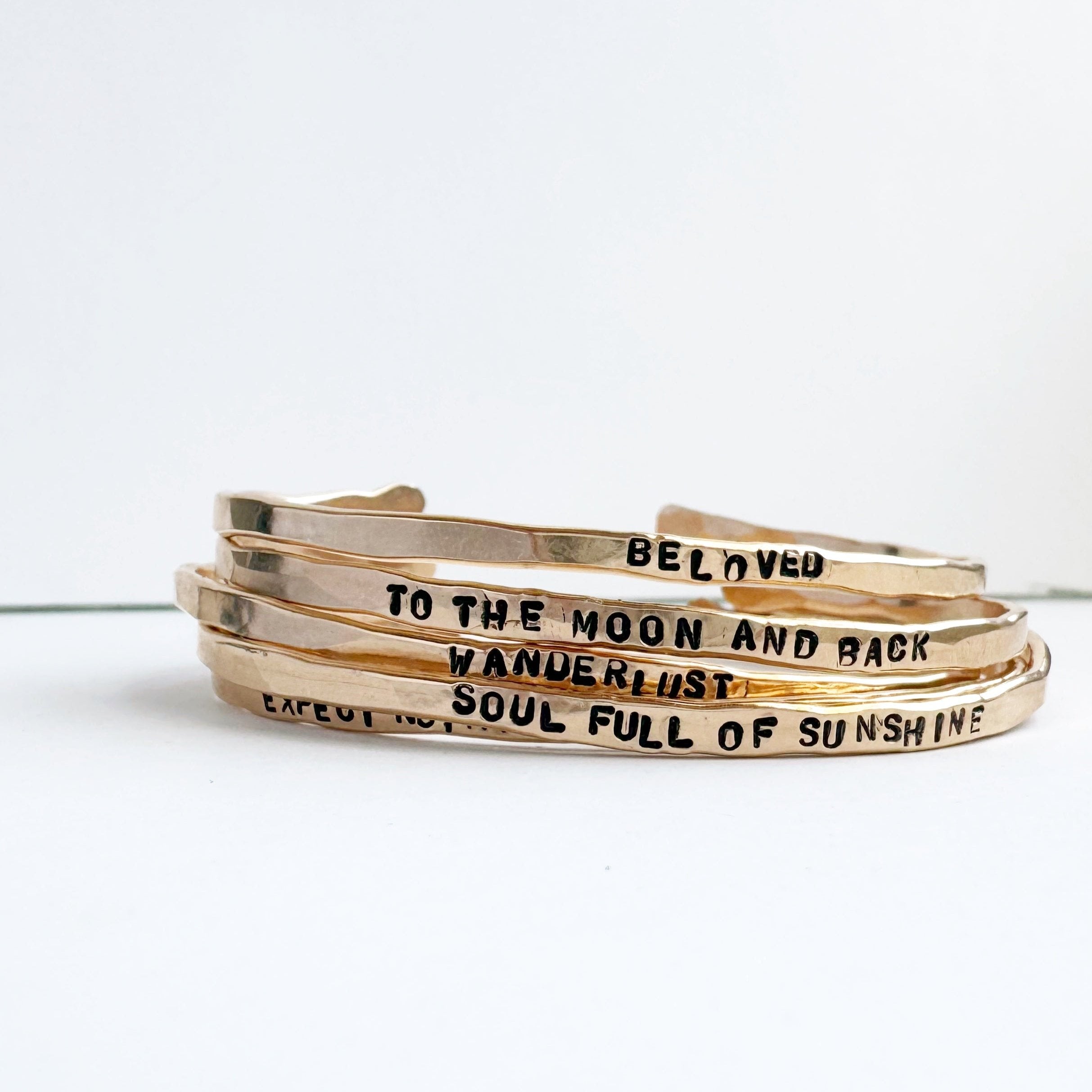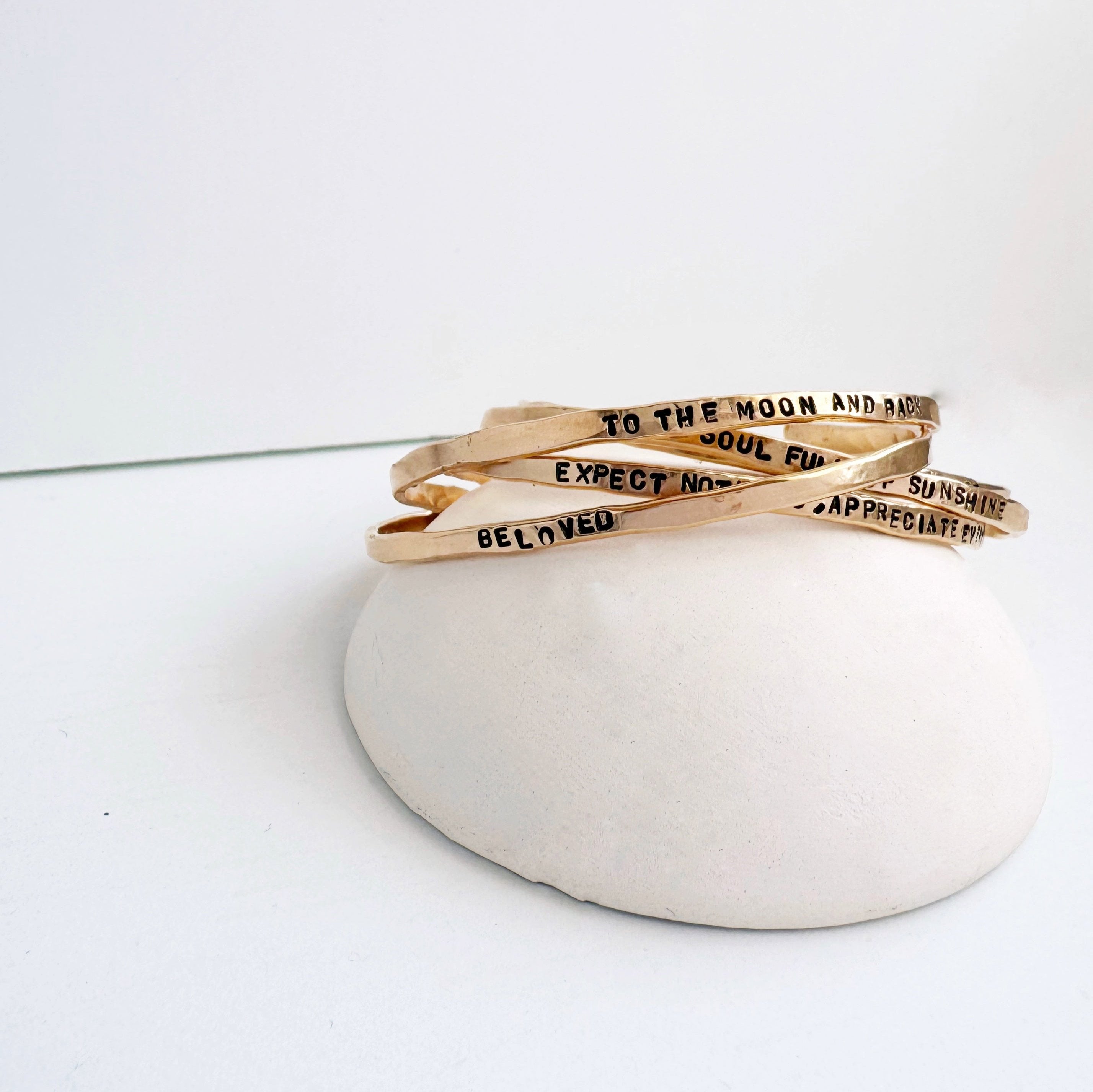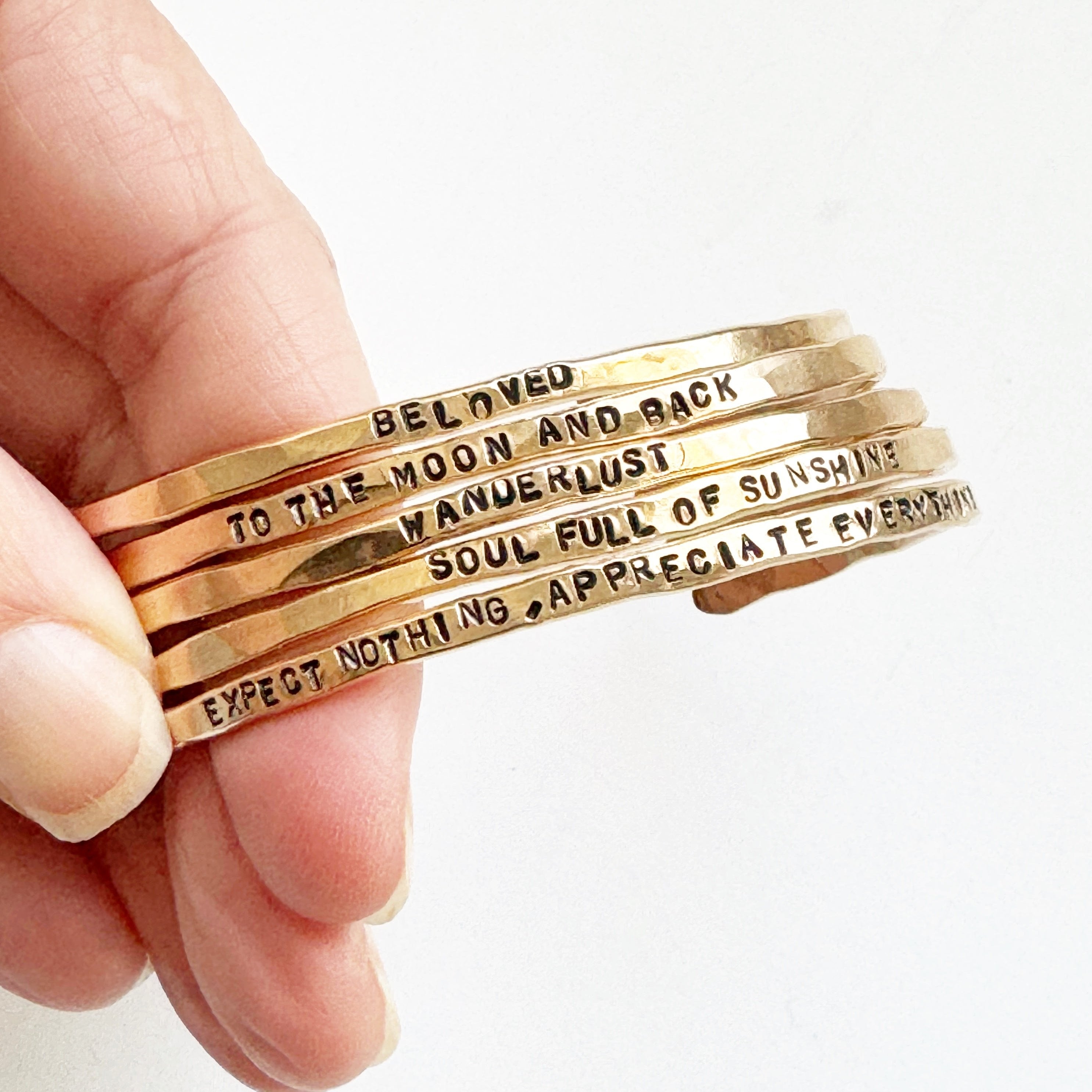 These beautiful bangles are first lightly hammered and shaped by our talented makers, so each one has its own unique personality and an organic feel. No two will ever be exactly alike. Next, the message is hand stamped one letter at a time. Letters may not always be perfectly centered and straight. This is part of the handmade organic charm of this special bracelet. It won't look like a machine made it, because a human did!