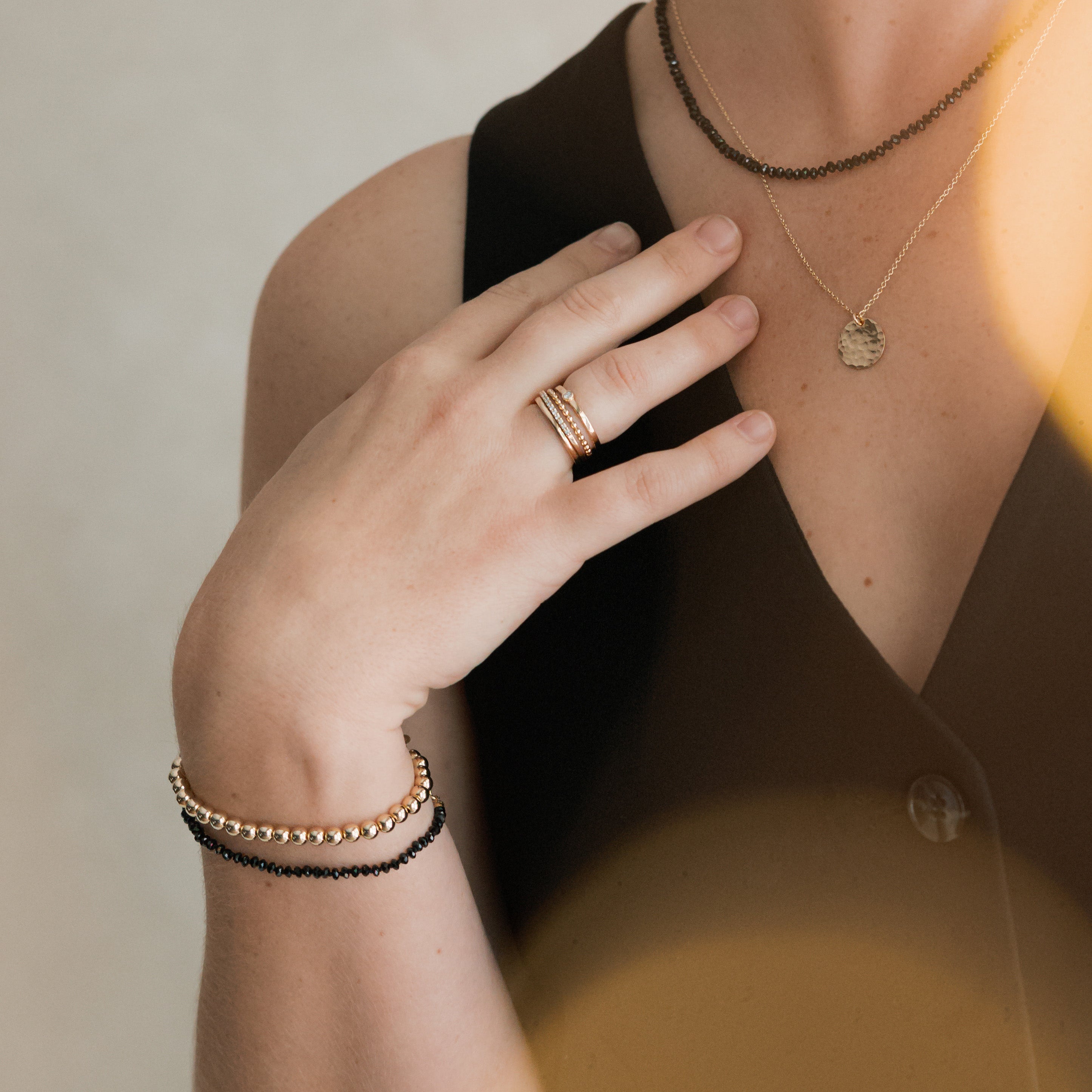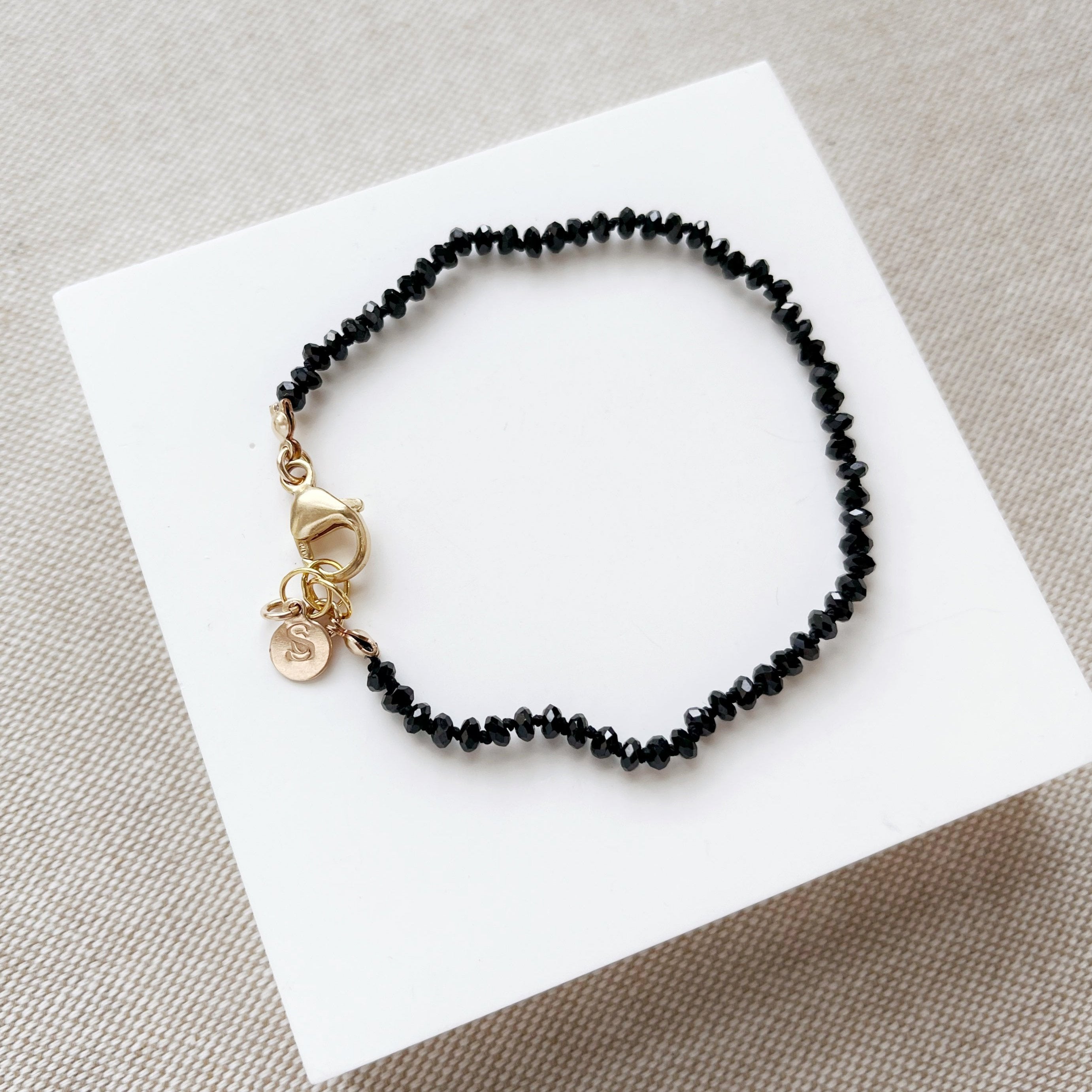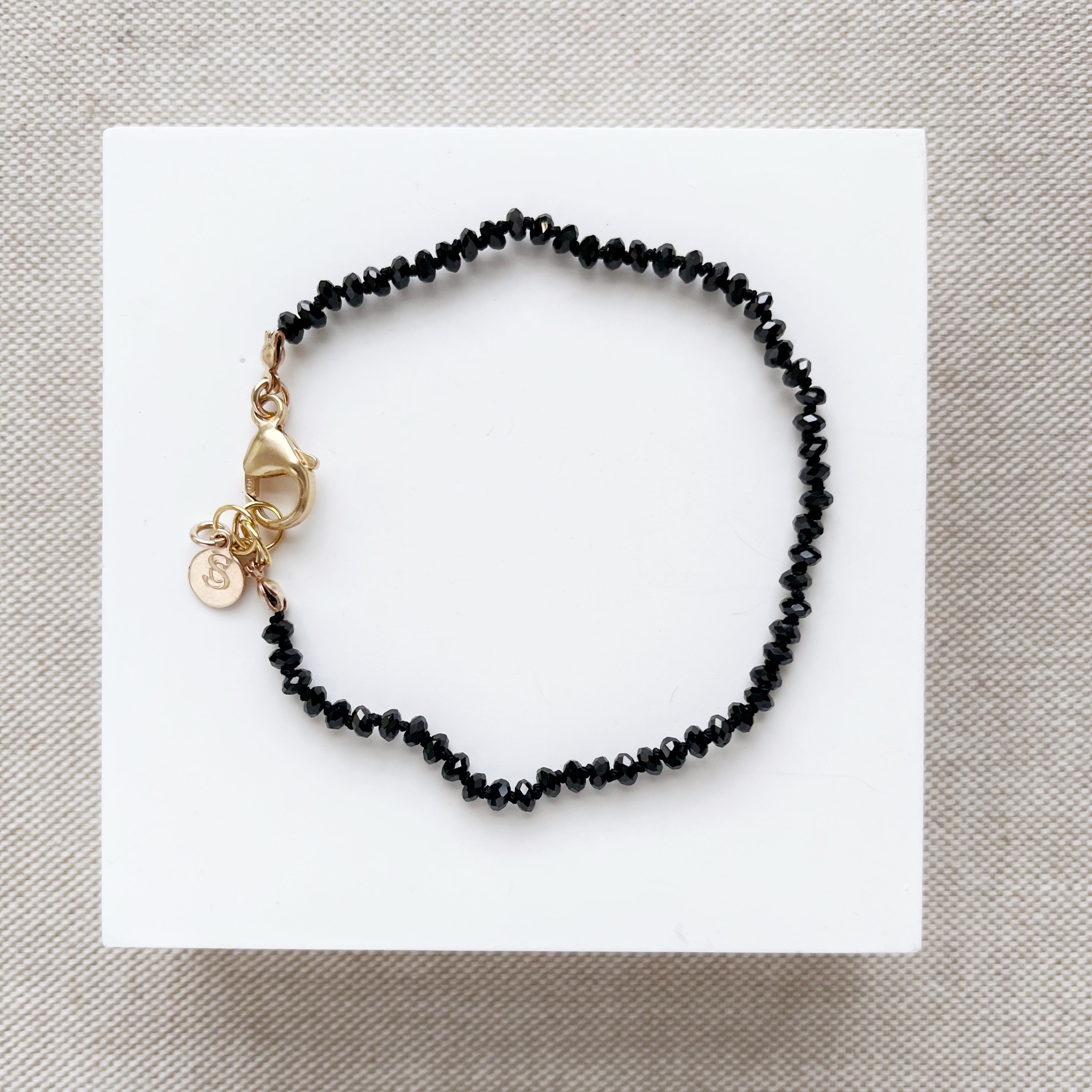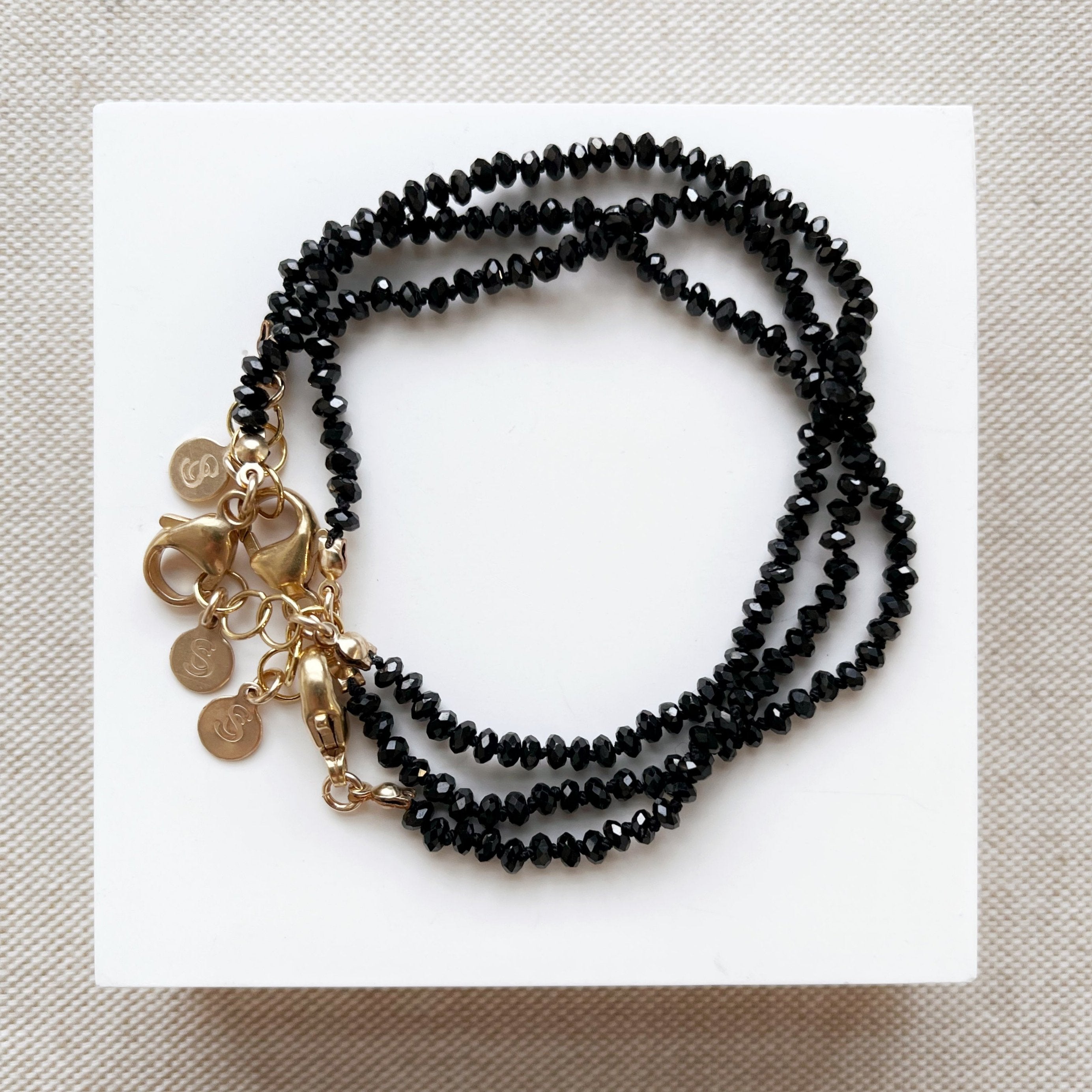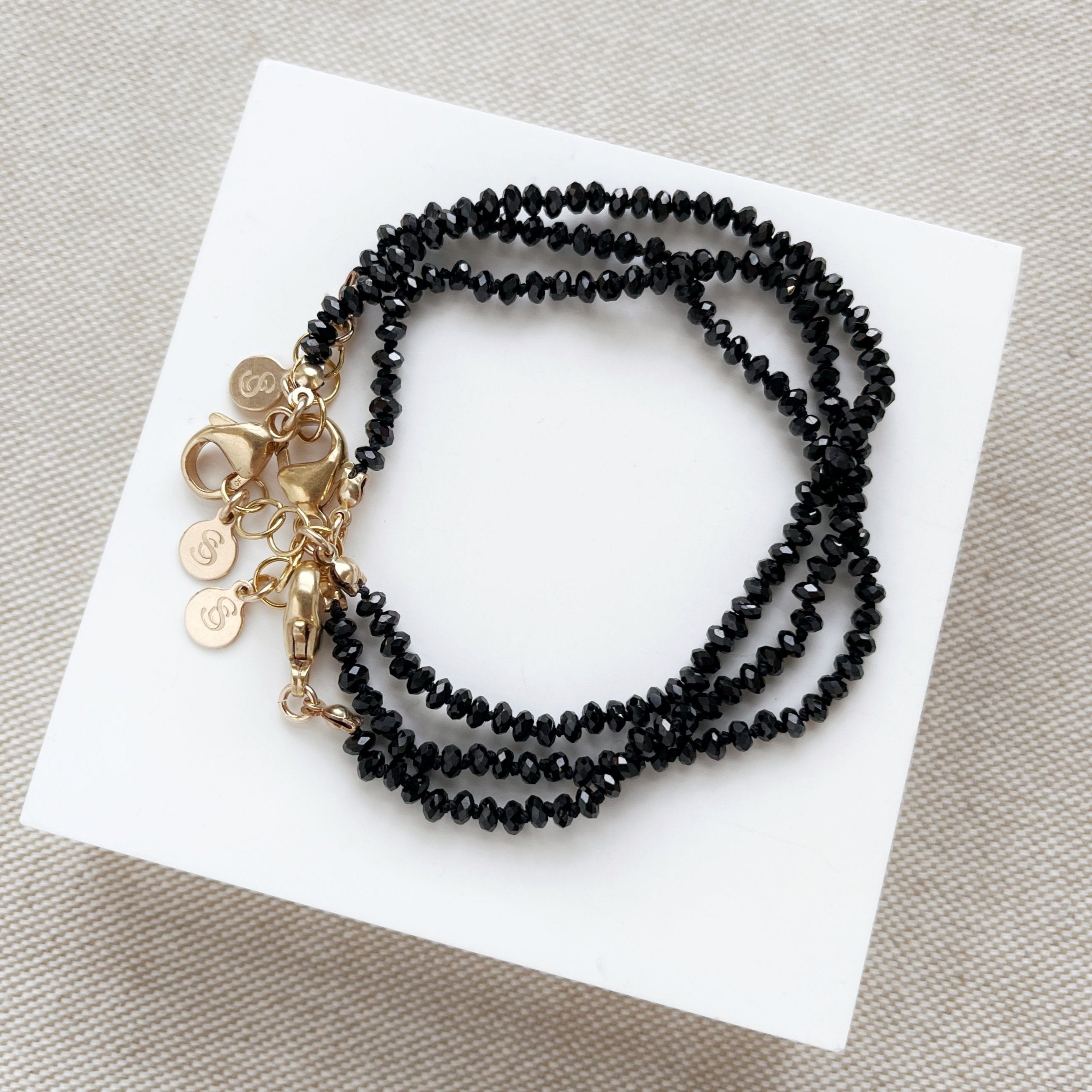 Full of glamour and sparkle, our Raven Bracelet features ultra-faceted black spinel gemstones. The spinel are knotted by hand, one by one, on black silk thread, for maximum light reflection and a luxurious and elegant look that makes it hard not to stare. This bracelet adds that extra sparkle to your wrist and layers beautifully with your everyday bracelet stack.