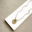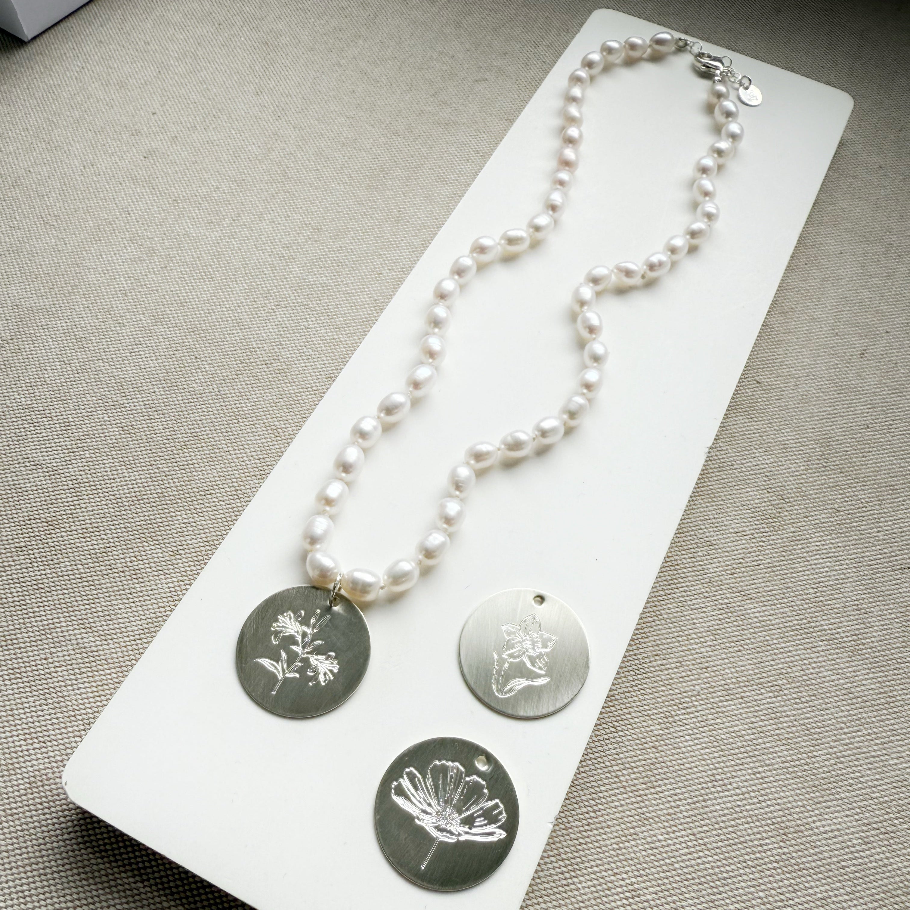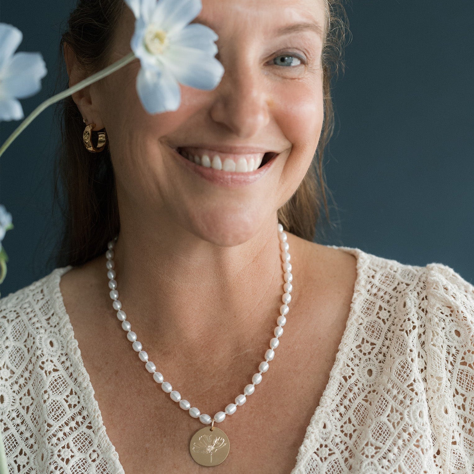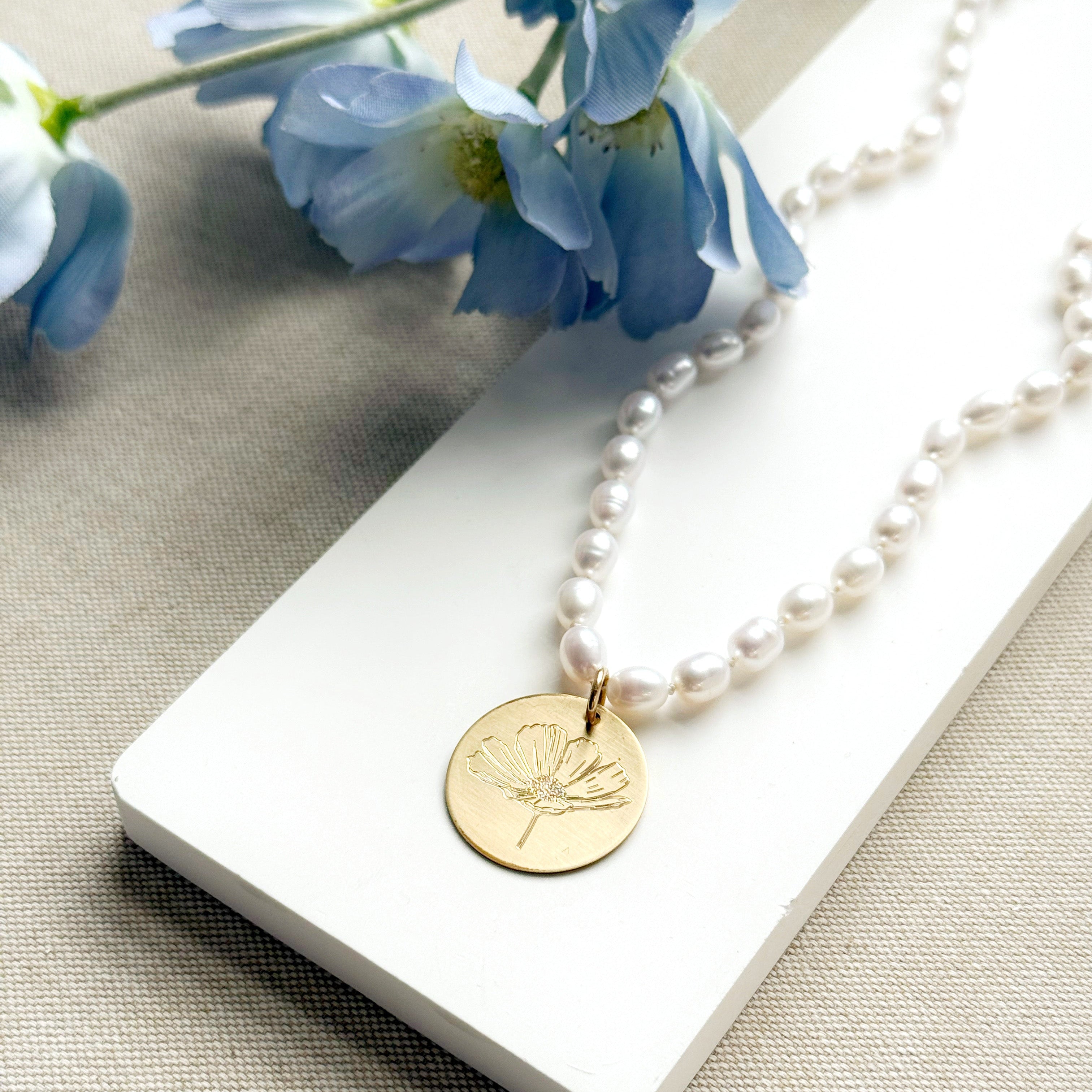 Our Birth Flower Pearl Necklace features timeless, natural, freshwater pearls, delicately knotted by hand on silk, with a 1-inch disc pendant. Our makers add a brushed finish and engrave each disc with an intricate flower design, representing each birth month.Â