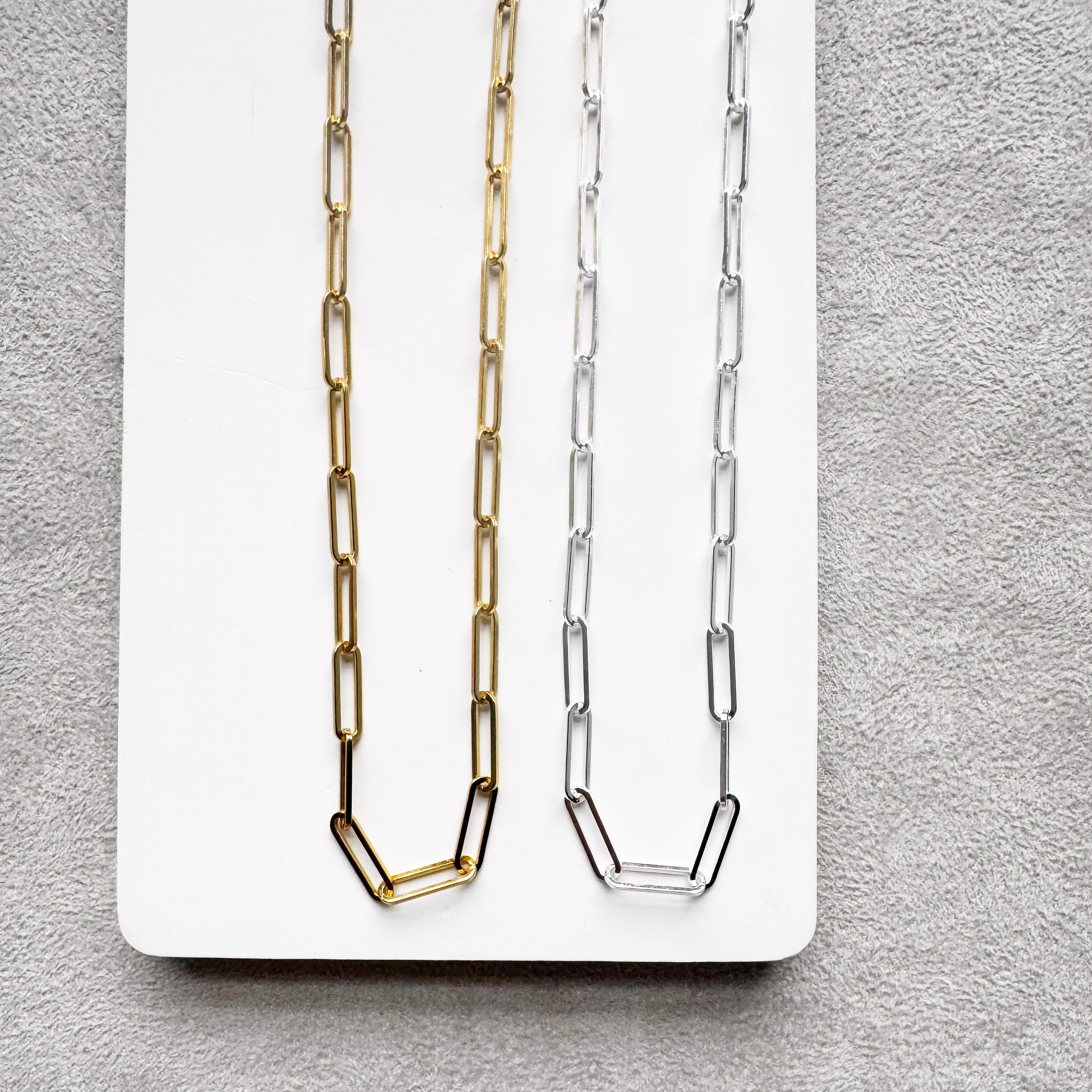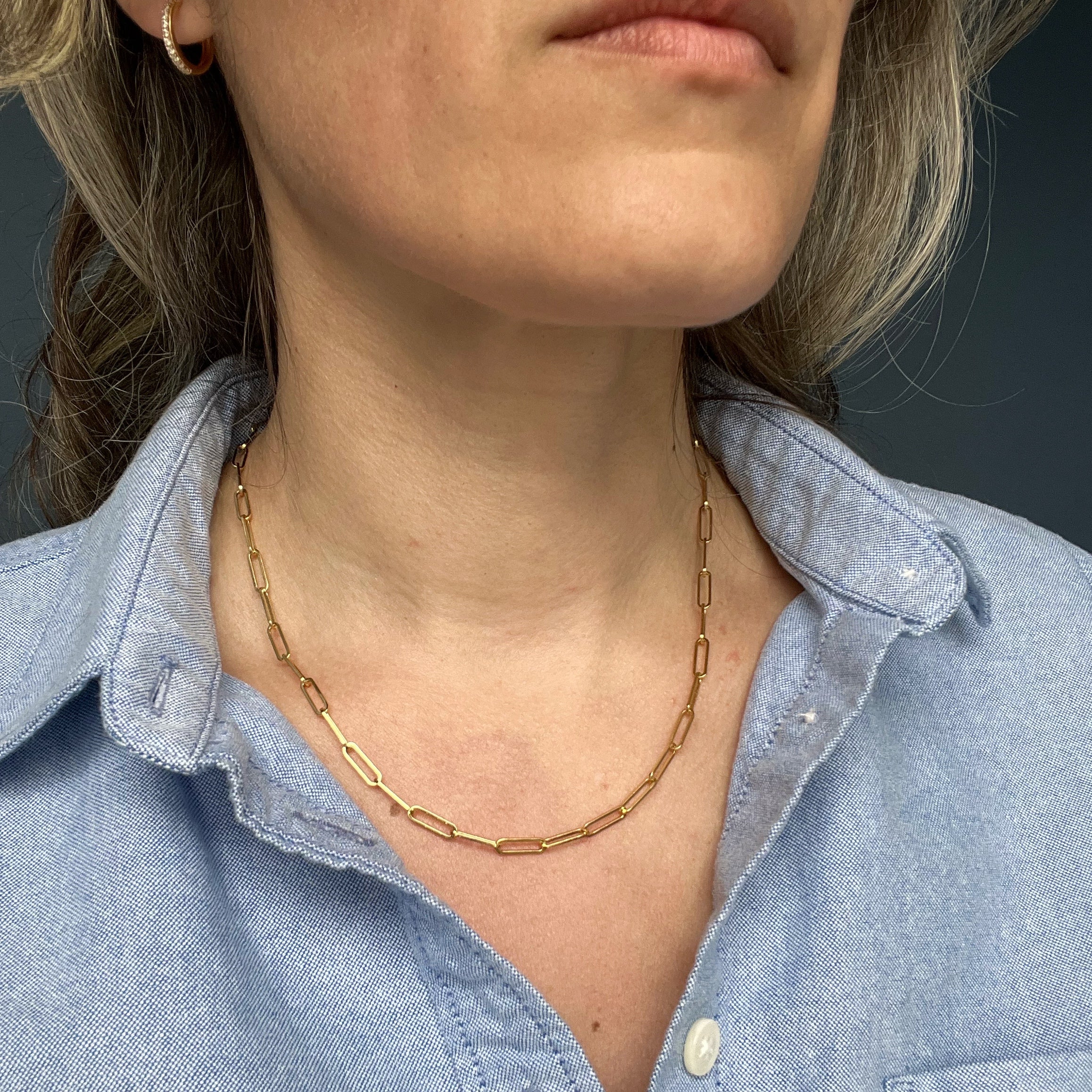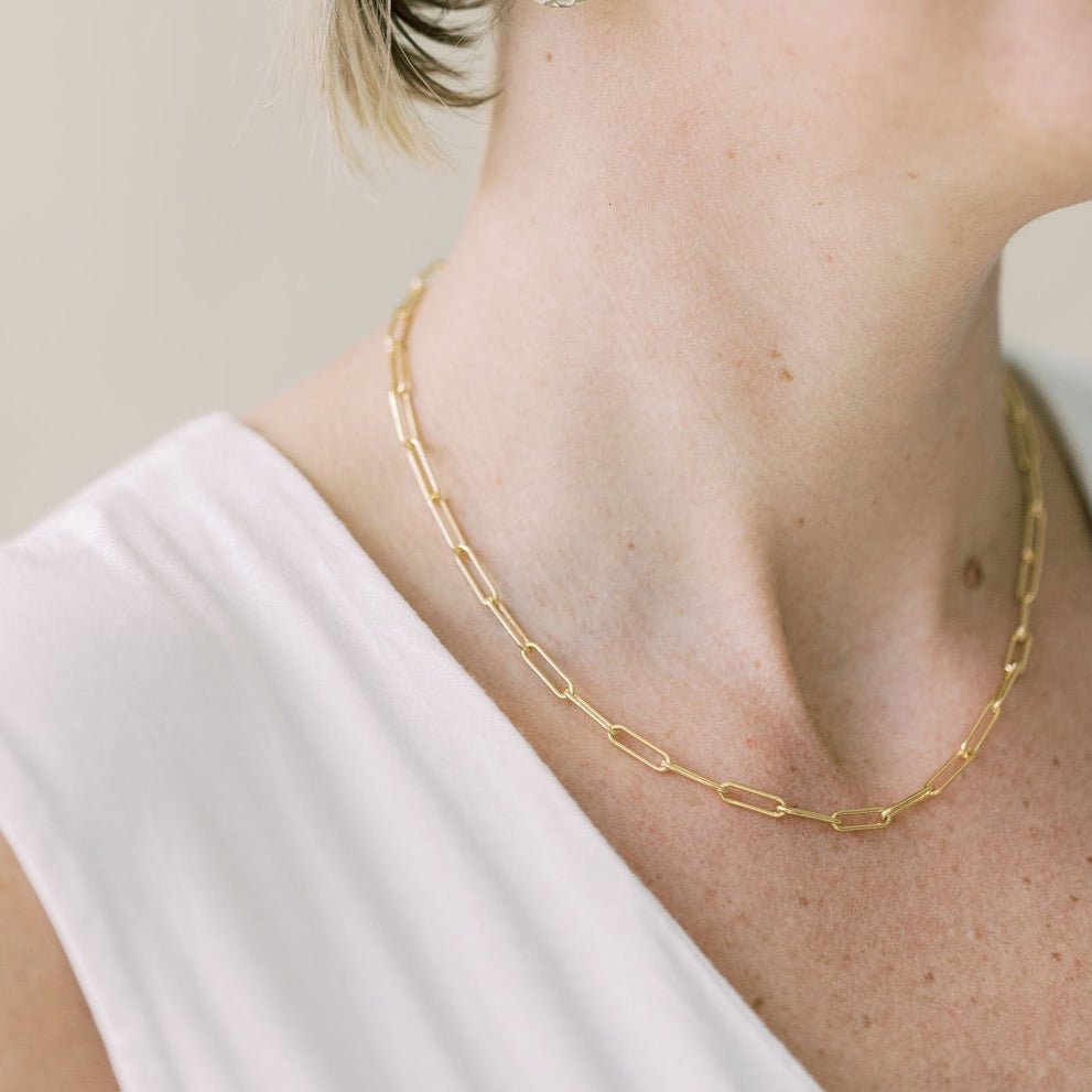 SC's large link Charleston Chain is a beloved customer favorite and the jewelry piece dreams are made of. Wear it solo for a bold, confident, unfussy look that speaks volumes on its own. Or layer Charleston with other necklaces - leveling up your look by adding that irresistible chunky texture and visual interest. If the "messy neck" trend is something you've been wanting to try, Charleston is a perfect player. It does not easily tangle with other necklaces, due to it's substantially sized links, making it perfect for piling on with all your other gemstone or chain pieces, proving that sometimes, the best style comes from embracing a little beautiful chaos.