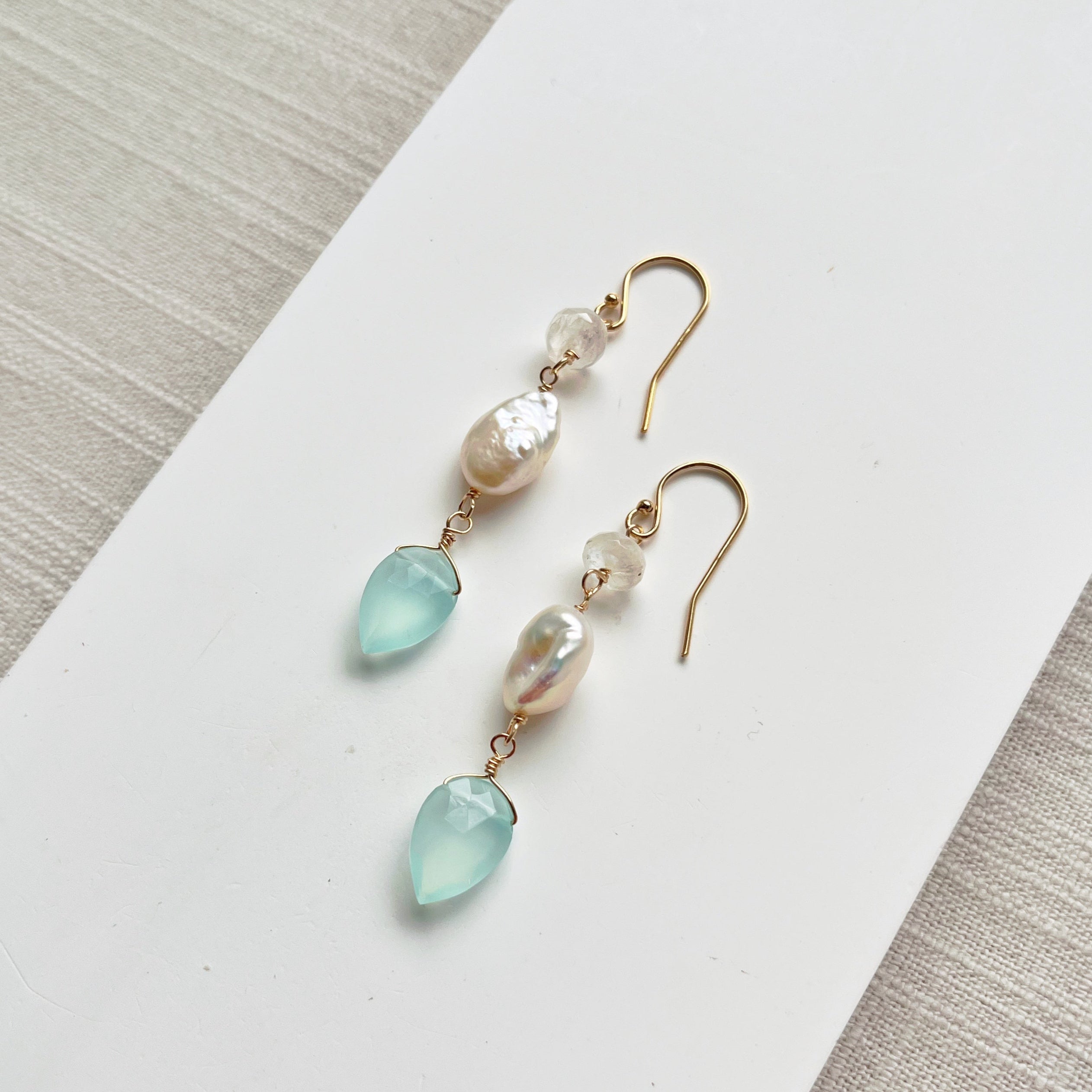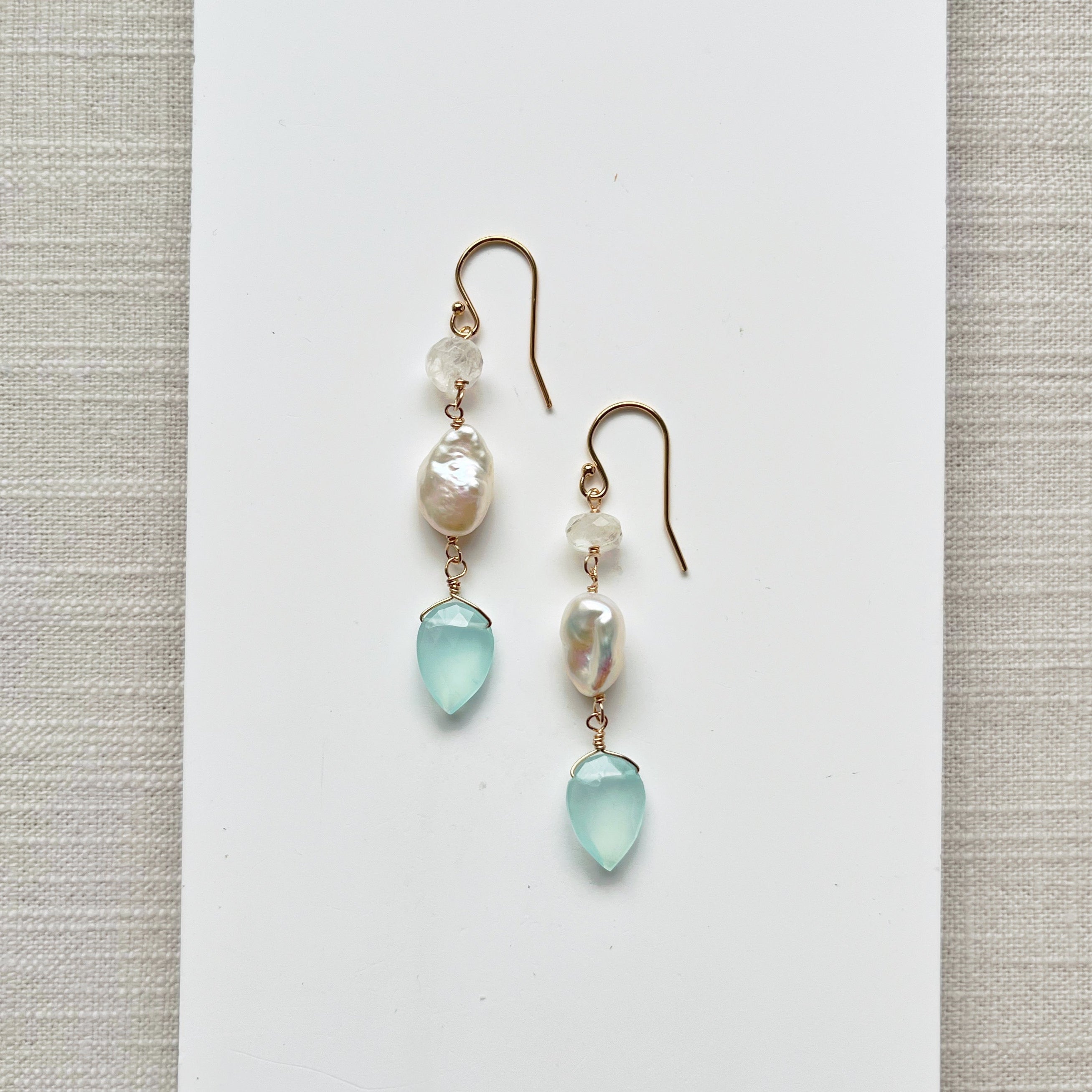 Delicate and organic, the Seafoam Earrings feature milky blue chalcedony, freshwater pearls and shimmery moonstone in a design that captures the beauty of an ocean spray with understated elegance and coastal charm. Wear them when you need a pop of color with everything from linen to silk to denim. Micro-batched, extremely limited quantity.
