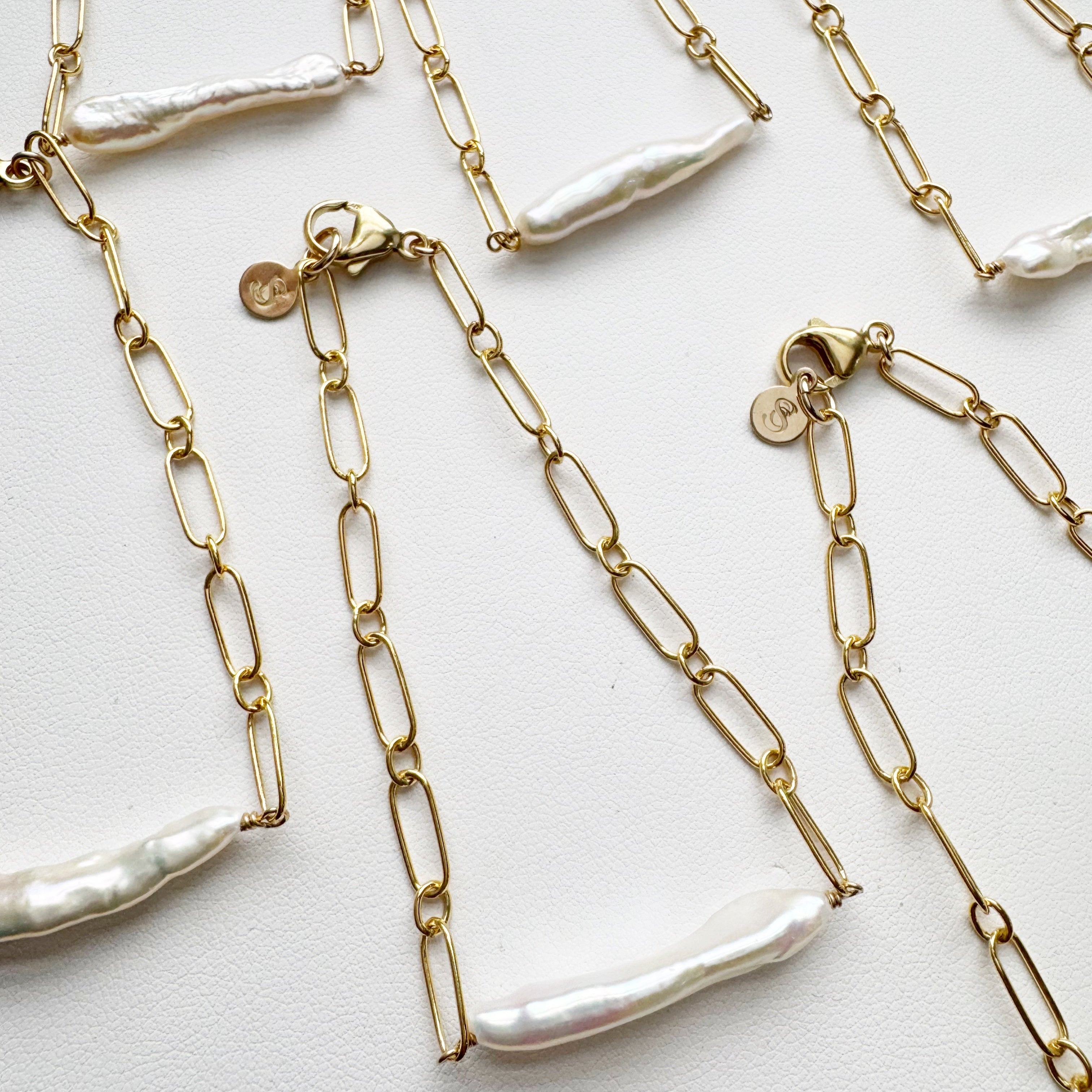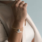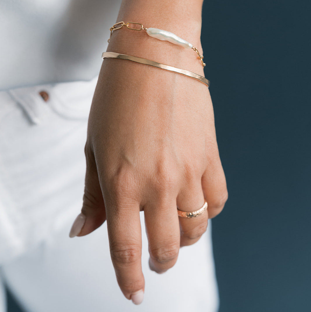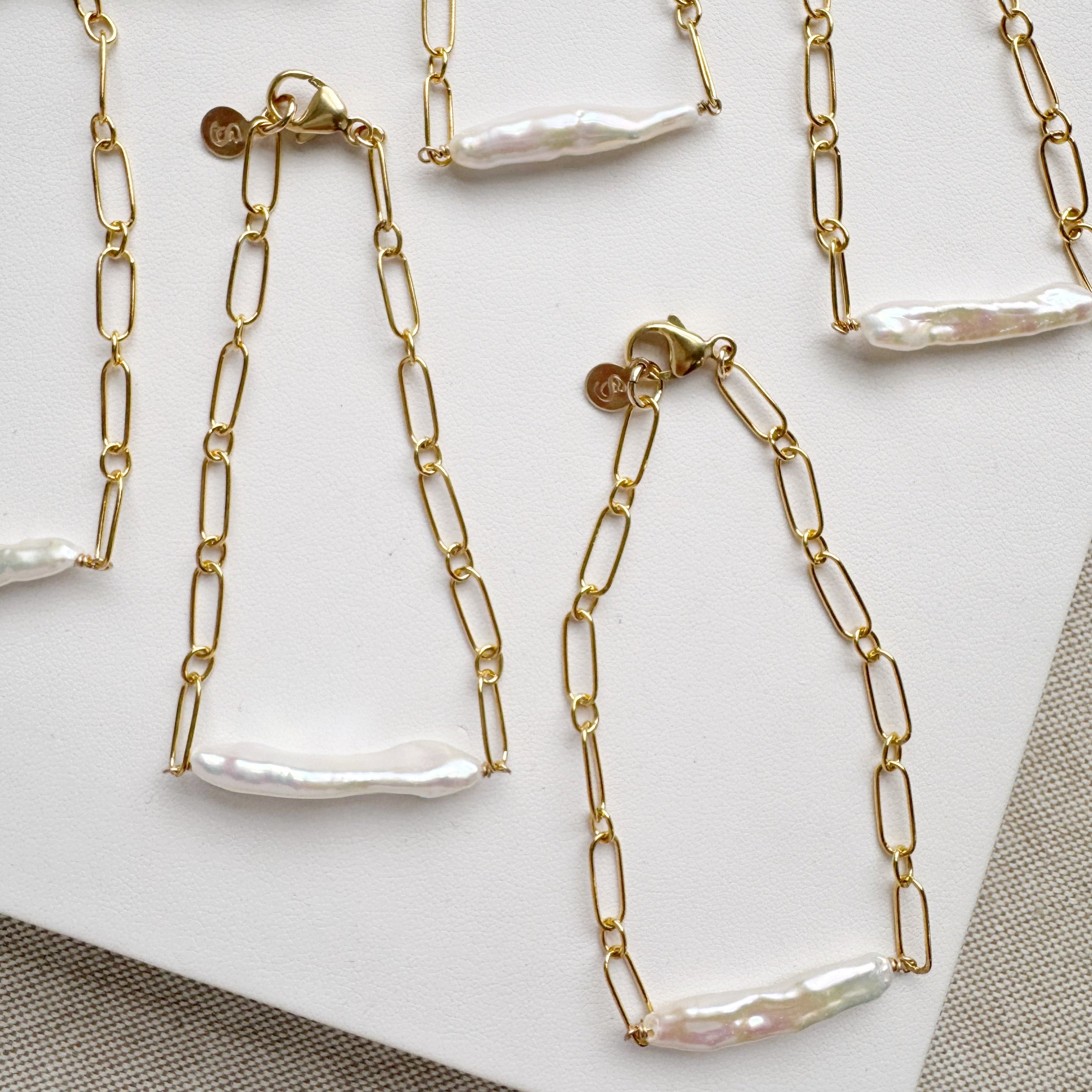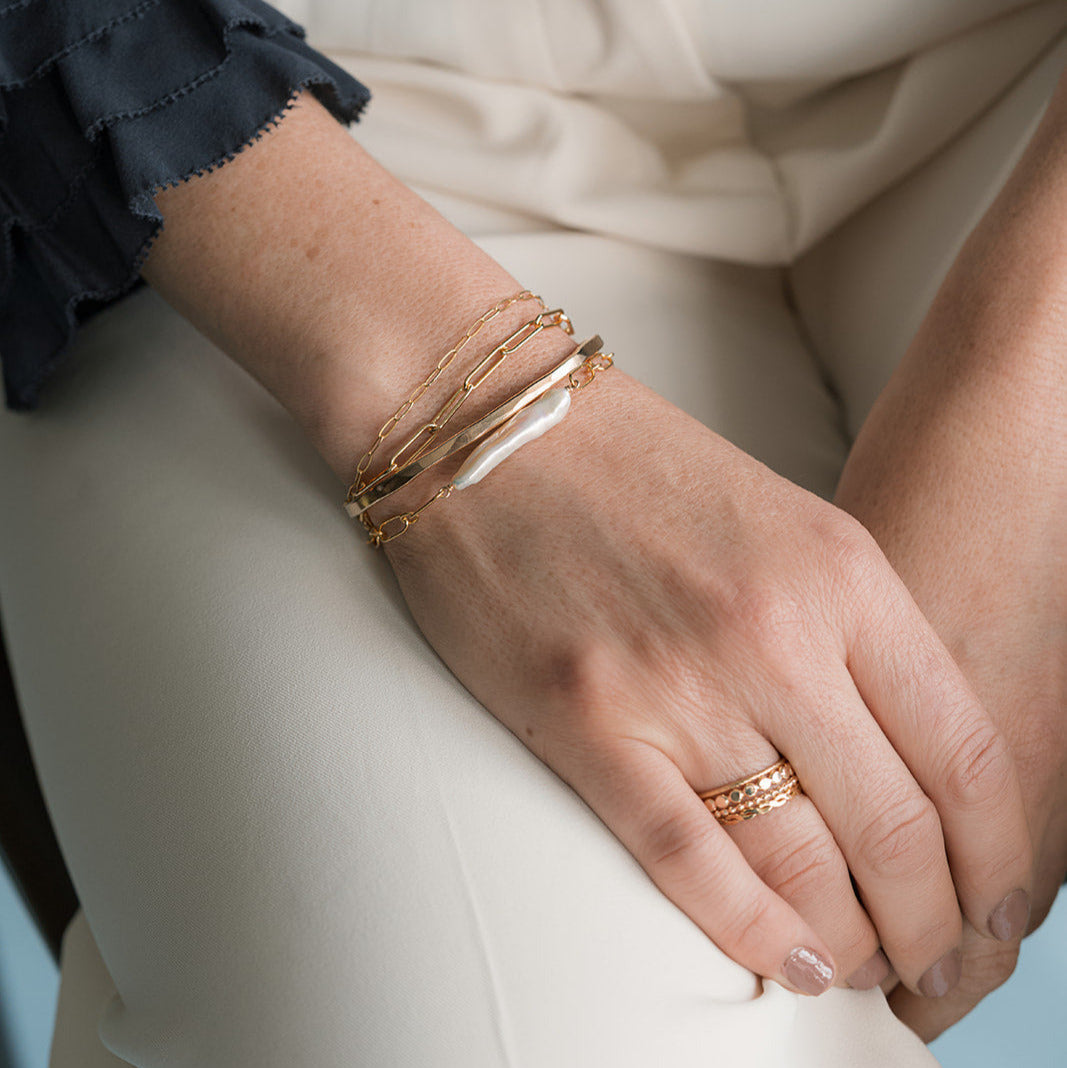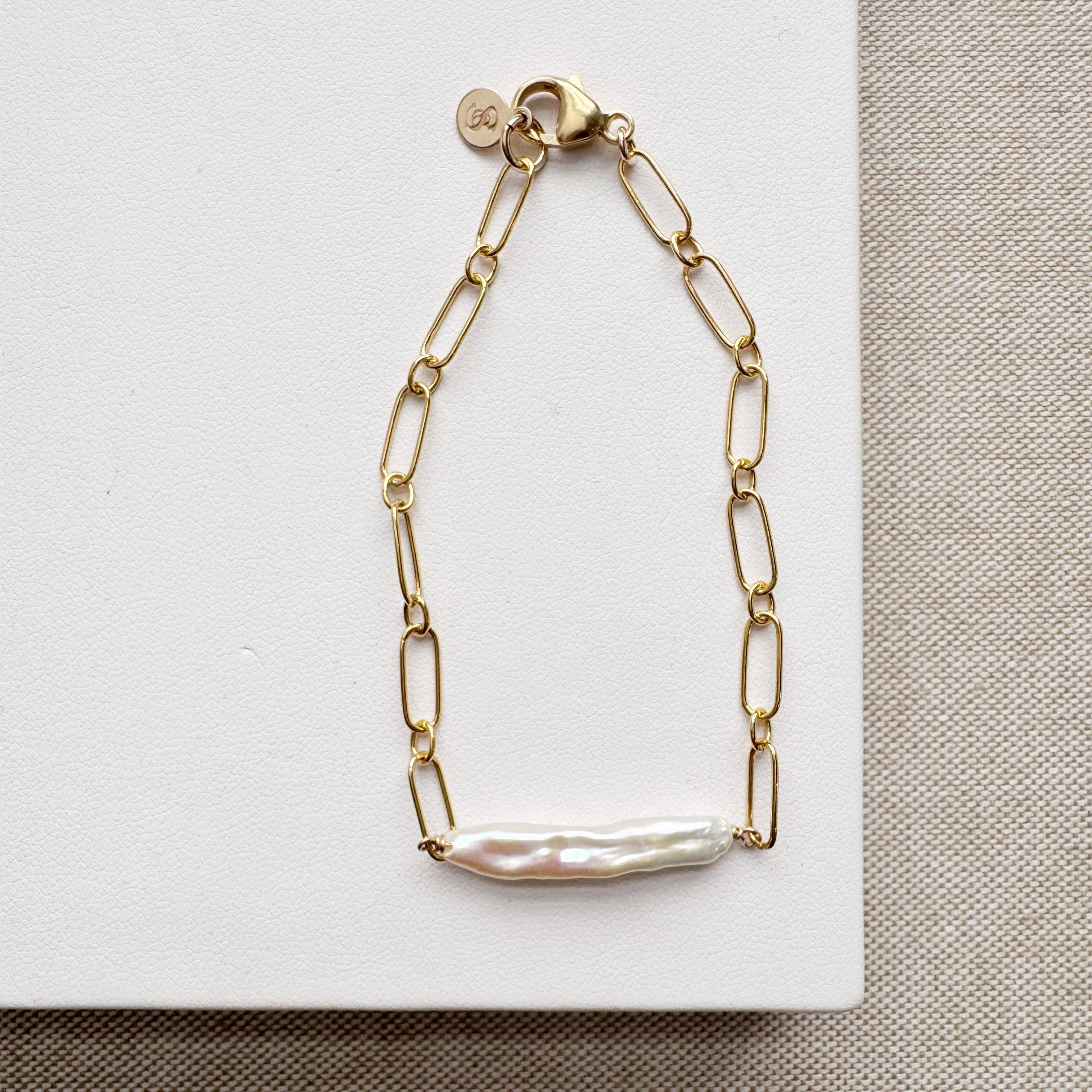 An enchanting combination that resonates with those who seek both simplicity and sophistication. A gorgeous white freshwater stick pearl is highlighted by a uniquely beautiful oval and round chain. The perfect piece to adorn your wrist or add interest to your bracelet stack.