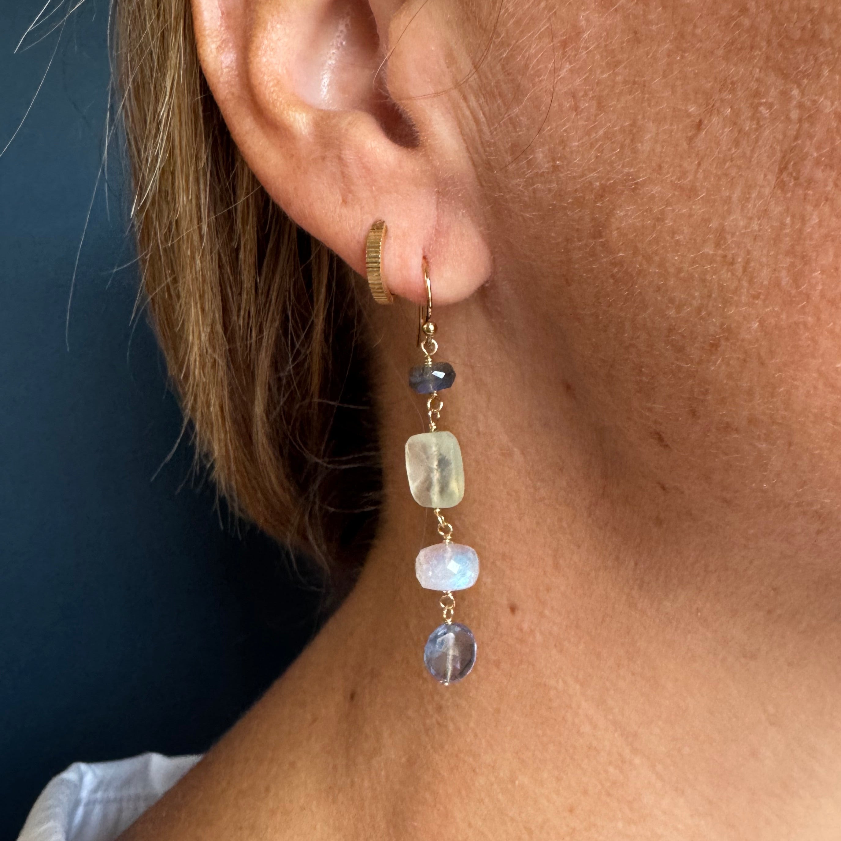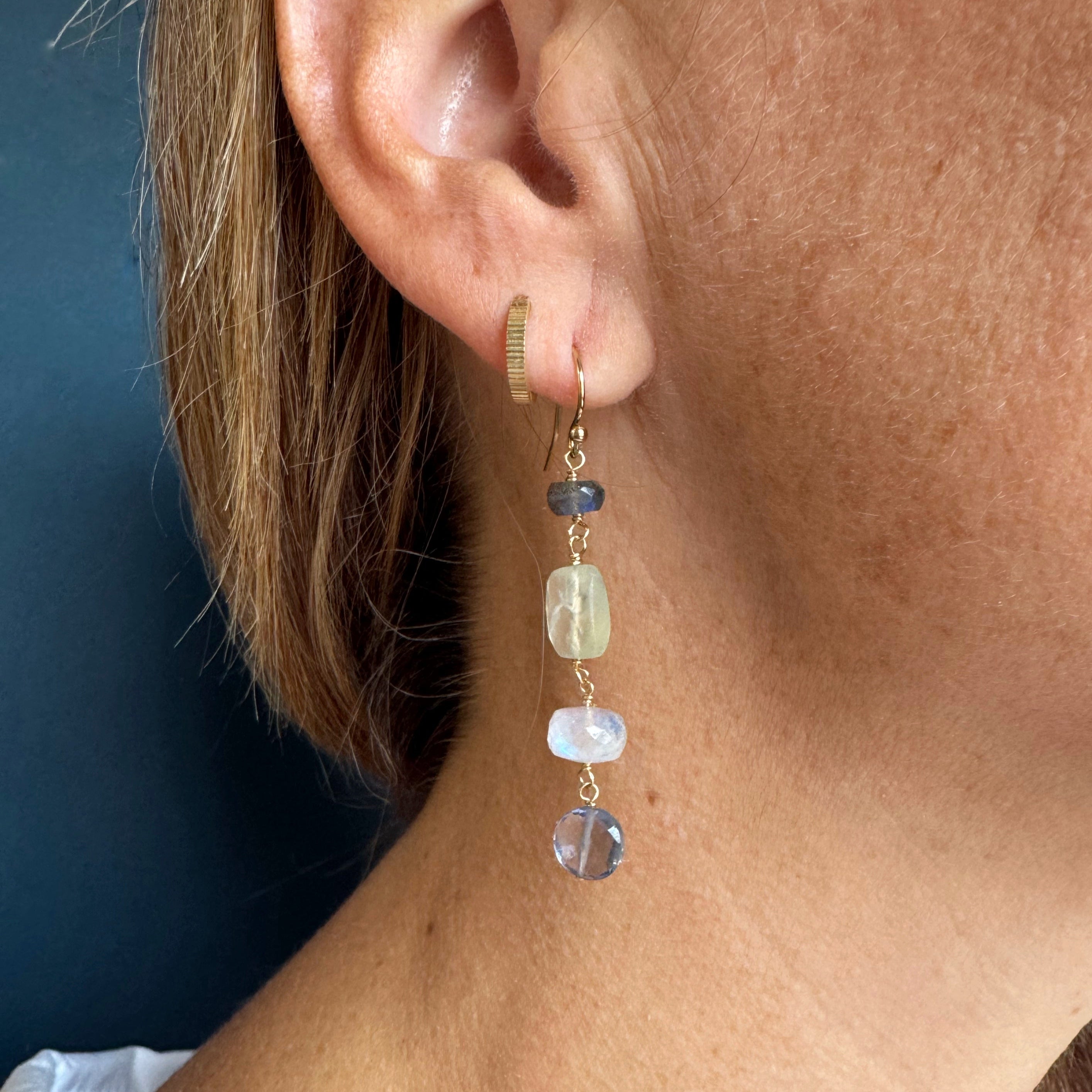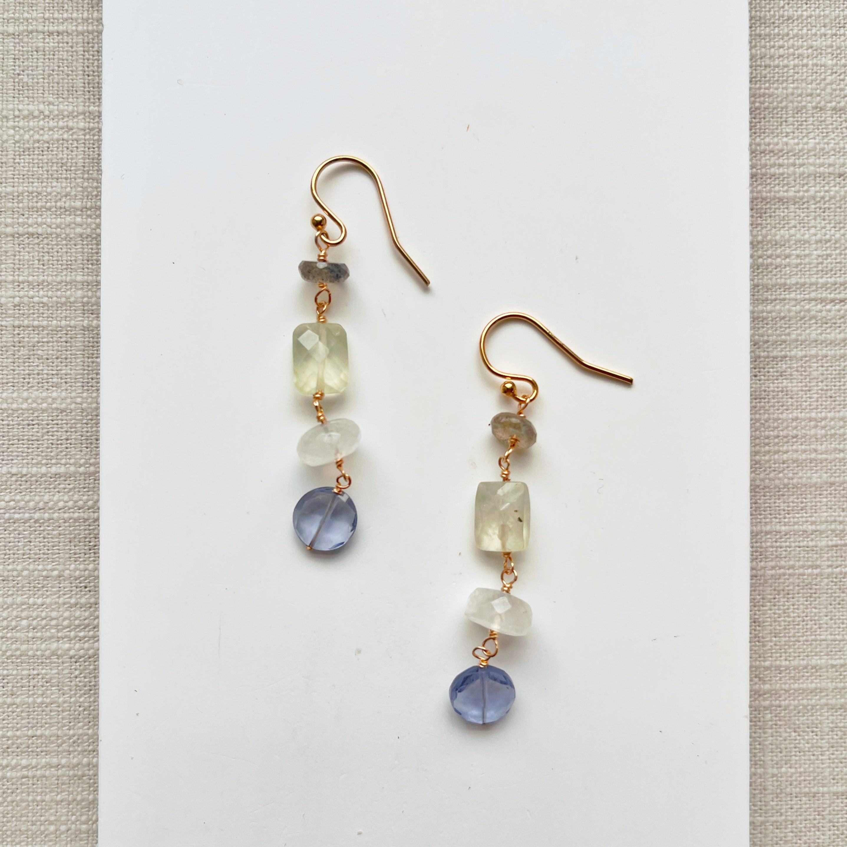 Unique cuts and sparkly faceted gemstones in cool serene tones make our Viola Earrings a coastal inspired treasure you'll reach for whenever your craving a little sparkle. The watery blue-purple iolite, glowy labradorite, seafoam green prehnite and shimmery moonstone make for a captivating palette. Each stone is hand selected and wire wrapped for you in our Doylestown, PA studio. Limited quantity!